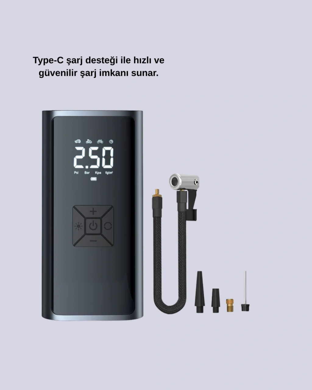80W kablosuz taşınabilir lastik pompası, pratikliği ve güçlü performansı bir arada sunar. Dört farklı mod ile araba, bisiklet, motosiklet ve toplar için kullanıma uygundur. Basınç değerlerini ayarlayabilir, dijital ekran sayesinde anlık takip edebilirsiniz.Kompakt tasarımı sayesinde her zaman yanınızda taşıyabileceğiniz bu cihaz, aracınızda fazla yer kaplamaz. Naylon örgüyle güçlendirilmiş dayanıklı yapısı, uzun ömürlü kullanım sağlar. Kablosuz şişirme teknolojisi, hızlı ve pratik bir kullanım imkanı sunar.LED ışık fonksiyonu, gece veya düşük ışıkta kolaylık sağlarken, SOS yardım modu acil durumlarda güvenliğinizi artırır. Hafif ve taşınabilir yapısıyla seyahatlerde büyük kolaylık sağlar.12V uyumlu olması sayesinde geniş kullanım imkanı sunar. Spor ekipmanları, şişme yatak ve kamp malzemeleri için de uygundur. Çok işlevli yapısı sayesinde tek cihazla birçok ihtiyacınızı karşılayabilirsiniz.