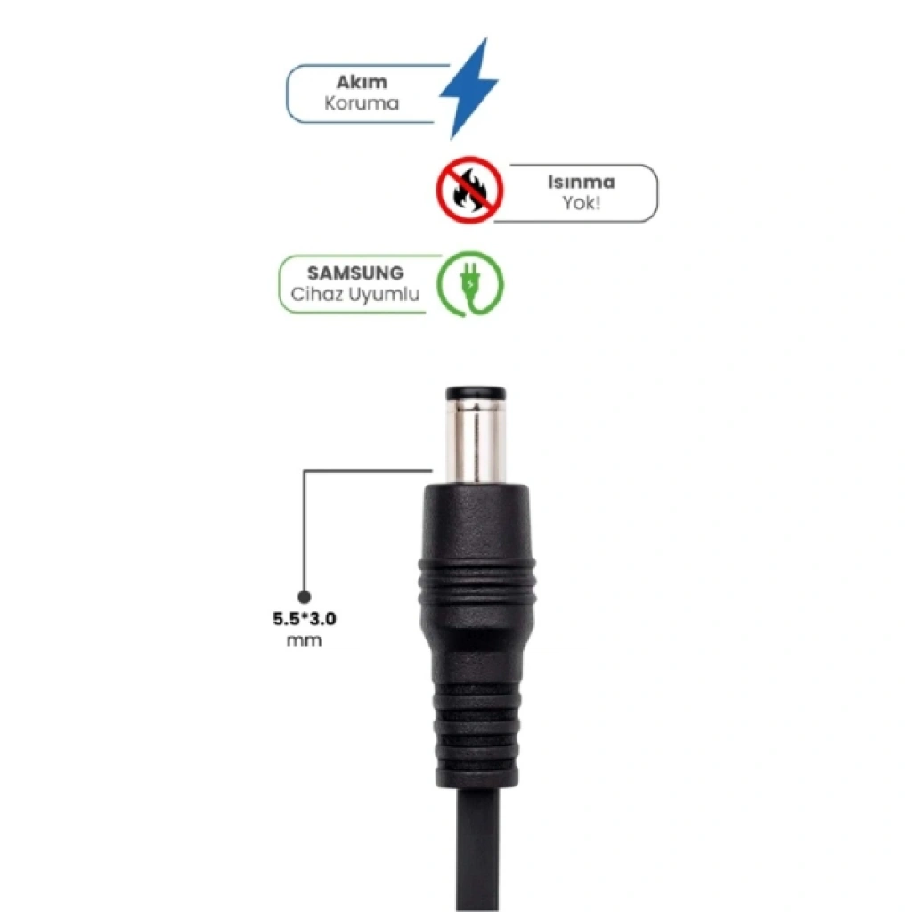 19V 4.74A 5.5 * 3.0MM 90W SAMSUNG İCİN LAPTOP ADAPTÖRÜrün Özellikleri19V 4.74A 5.5 * 3.0 mm 90W Samsung İçin Laptop Adaptör, Samsung dizüstü bilgisayar modelleriyle yüksek uyumluluk sunan güçlü ve güvenilir bir şarj çözümüdür. 90 Watt çıkış gücü ile cihazınızı hızlı, kararlı ve güvenli bir şekilde şarj ederken akım koruma teknolojisi sayesinde elektrik dalgalanmalarına karşı ekstra güvenlik sağlar.Dayanıklı yapısı sayesinde uzun süreli kullanımlarda stabil performans sunar ve ısınma riskini minimuma indirir. AC 110-240V geniş voltaj aralığıyla yurtiçi ve yurtdışı kullanımlarda sorunsuz çalışır. 1.5 metre power kablosu, çalışma alanında rahat kullanım imkânı tanır. Samsung cihazlarla birebir uyumlu tasarımı sayesinde pratik bağlantı ve yüksek verimlilik sağlar.Paket İçeriği1 adet 19V 4.74A 5.5 * 3.0 mm 90W Samsung Laptop Adaptör
