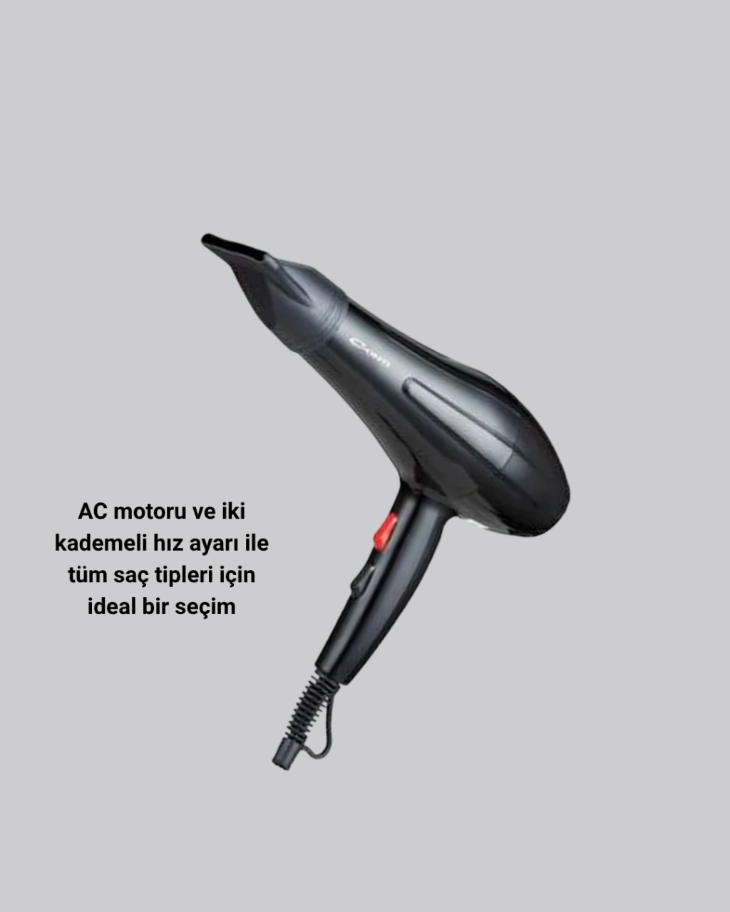 Salon kalitesinde performans artık evinizde!Bu 2200 Watt profesyonel fön makinesi, güçlü AC motoru sayesinde saçlarınızı kısa sürede kuruturken yıpranmayı en aza indirir.İki kademeli hız ve sıcaklık kontrolü, saç tipinize göre mükemmel uyum sağlar.İster yoğun sıcak hava ile hızlı kurutma, ister nazik rüzgarla şekillendirme yapın, sonuç her zaman profesyonel!Soğuk hava üfleme özelliği, saç şeklinizi sabitler ve elektriklenmeyi önler.Bu sayede saçlarınız gün boyu parlak ve pürüzsüz kalır.Dayanıklı AC motoru, uzun ömürlü kullanım sunarak profesyonel kuaförlerin tercih ettiği performansı sağlar.Hafif gövdesi ve ergonomik tutuşu ile elinizi yormadan uzun süre kullanabilirsiniz.Sadece ev kullanımı için değil, kuaför salonları, seyahatler veya çekim setleri için de mükemmel bir seçenektir.Taşınabilir ve kompakt tasarımı, çantanızda kolayca yer bulur.Kablo uzunluğu ve ısıya dayanıklı dış gövdesi, kullanım kolaylığını artırır.Şık görünümüyle banyonuza modern bir dokunuş katar.Güç, hız ve zarafet bir arada!Bu fön makinesiyle her gün kuaförden yeni çıkmış gibi hissedeceksiniz.