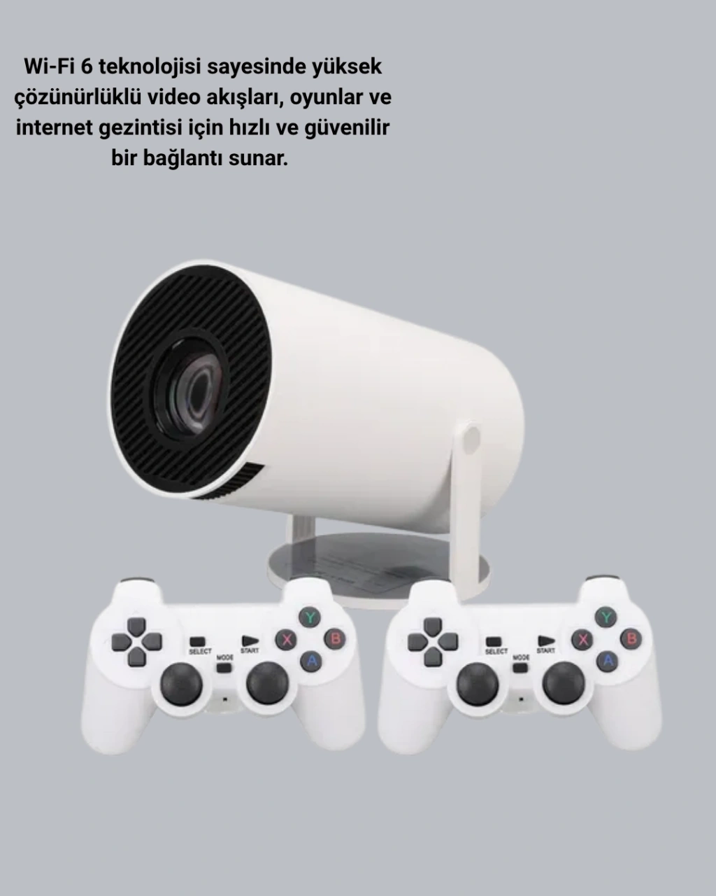 4K destekli Wi-Fi 6 Projeksiyon Cihazı, yüksek performanslı bağlantı özellikleri ve üstün görüntü kalitesiyle evde sinema keyfini yeniden tanımlar. Kablosuz Wi-Fi 6 teknolojisi sayesinde kesintisiz ve hızlı bağlantı kurabilir, videolarınızı, oyunlarınızı veya sunumlarınızı kolayca yansıtabilirsiniz. Bluetooth 5.0 desteğiyle kablosuz hoparlörlere bağlanarak güçlü bir ses deneyimi yaşarsınız.Çift kollu ayarlanabilir tasarımı, cihazın konumunu esnek bir şekilde ayarlamanızı sağlar. Bu özellik, görüntüyü dilediğiniz açıya göre optimize etmenize imkân tanır. 4K çözünürlük desteği ile canlı renkler, yüksek kontrast ve net görüntüler elde edersiniz.Oyun tutkunları için geliştirilen bu cihaz, 10.000’den fazla oyun desteğiyle eğlencenin sınırlarını ortadan kaldırır. HDMI, AUX ve USB portları sayesinde bilgisayar, konsol, telefon veya tablet gibi birçok cihazla kolay bağlantı kurabilirsiniz.Ekran yansıtma özelliği ile telefon veya bilgisayarınızdaki içerikleri anında büyük ekrana aktarabilirsiniz. Hafif ve taşınabilir yapısı sayesinde evde, ofiste ya da dış mekanlarda kolaylıkla kullanılabilir.Wi-Fi 6 teknolojisinin sağladığı yüksek hız ve düşük gecikme avantajıyla video, oyun ve sunumlarda akıcı bir deneyim yaşayın. Modern teknolojiyi, taşınabilir tasarımla birleştiren bu cihaz, her ortamı eğlence alanına dönüştürür.