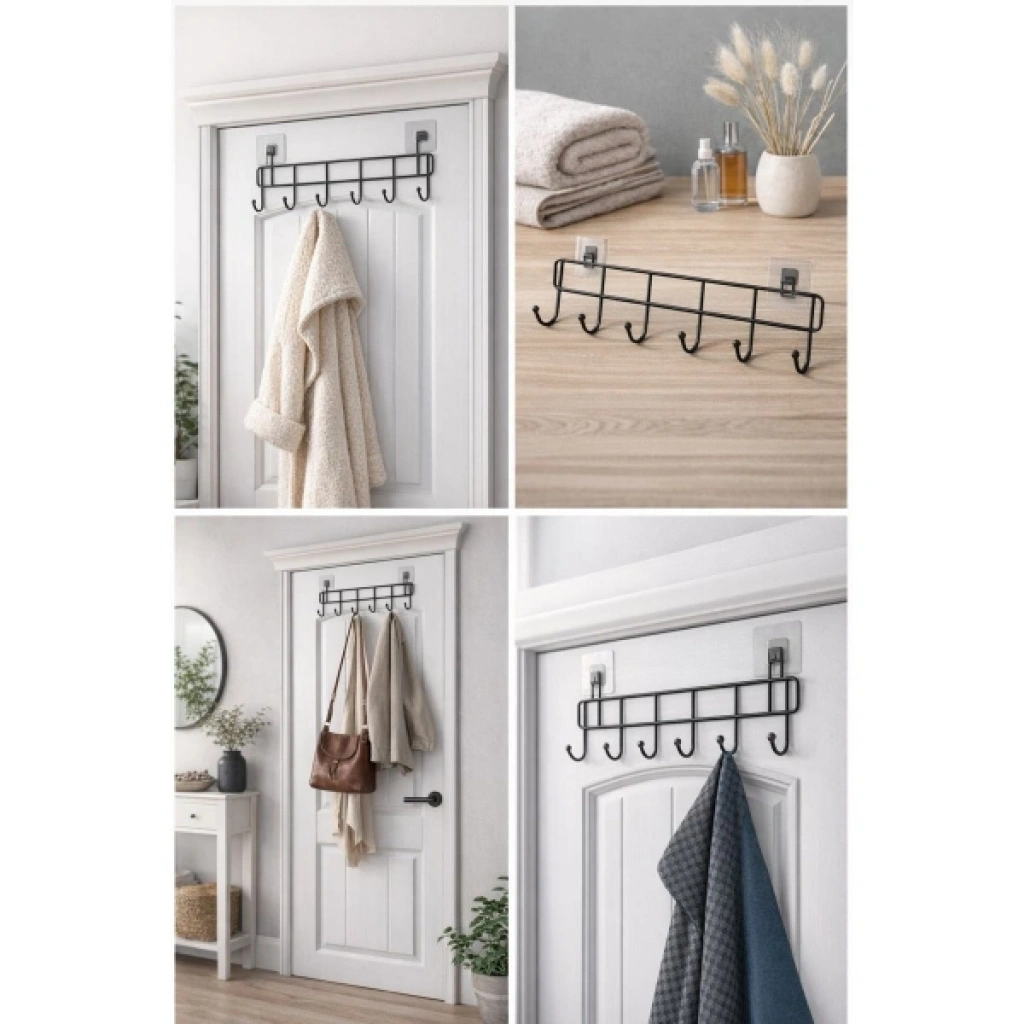 6'LI YAPIŞKANLI KAPI ARKASI ASKIÜrün Özellikleri6'lı yapışkanlı kapı arkası askı, ev ve ofis düzenini pratik şekilde sağlamak isteyenler için tasarlanmış fonksiyonel bir depolama çözümüdür. Delme veya vidalama gerektirmeyen yapışkanlı kapı arkası askı tasarımı sayesinde kapı, dolap kapağı veya düz yüzeylere kolayca uygulanabilir. Toplam altı askı bölümüne sahip olan ürün; mont, ceket, çanta, havlu, bornoz ve aksesuar gibi eşyaların düzenli şekilde asılmasına imkân tanır. Dayanıklı metal gövdesi sayesinde günlük kullanımda sağlam duruş sergilerken, siyah renkli sade tasarımı ile her ortama uyum sağlar. Yaklaşık 45 cm genişliği sayesinde alanı verimli kullanır ve dar alanlarda bile yüksek depolama avantajı sunar. Ev, banyo, mutfak ve ofis gibi alanlarda tercih edilen çok amaçlı duvar askısı, düzenli ve toplu bir görünüm elde etmeye yardımcı olur.Ürün Teknik Özellikleri Özellik Açıklama Ürün Adı 6'lı Yapışkanlı Kapı Arkası Askı Askı Sayısı 6 adet Genişlik 45 cm Yükseklik 9 cm Malzeme Dayanıklı metal Montaj Yapışkanlı, delmesiz kullanım Kullanım Alanı Kapı arkası, dolap, duvar Kullanım Amacı Düzenleme ve asma çözümü Paket İçeriği1 adet 6'lı yapışkanlı kapı arkası askı