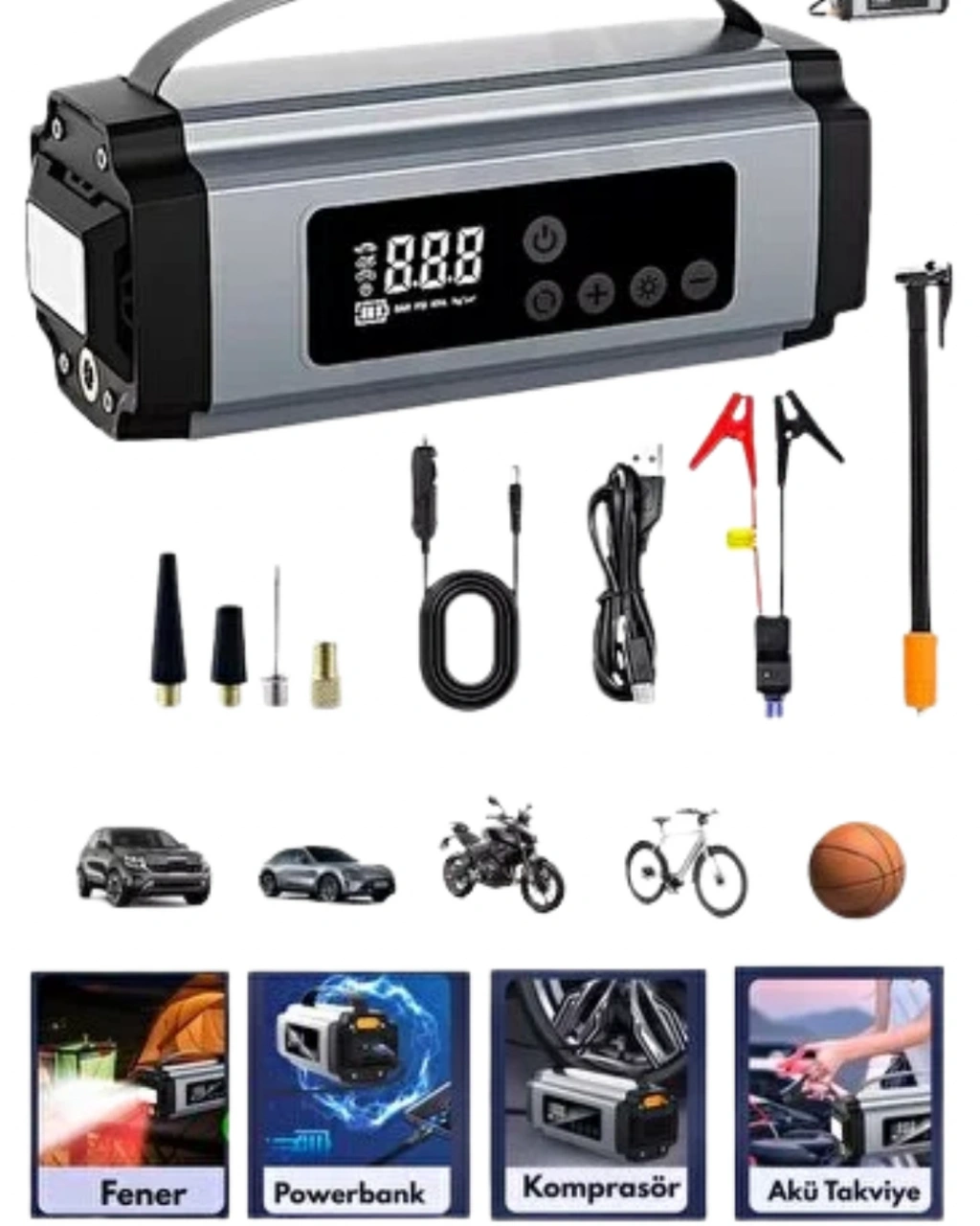 Uzun yolculuklar, kamp planları ve şehir dışı seyahatler keyifli olduğu kadar hazırlık gerektirir. Yol boyunca yaşanabilecek küçük aksaklıklar, doğru ekipman olmadığında büyük sorunlara dönüşebilir. Bu çok fonksiyonlu taşınabilir cihaz, sürücülere ve gezginlere tek bir üründe birçok çözüm sunarak yolculukları daha güvenli ve konforlu hale getirir.Araç aküsünün beklenmedik şekilde boşalması, özellikle ıssız bölgelerde ciddi bir problem olabilir. Bu cihaz, güçlü akü takviye özelliği sayesinde aracınızı başka bir araca ihtiyaç duymadan çalıştırmanıza yardımcı olur. Kompakt yapısı sayesinde kamp ekipmanlarınızın arasında kolayca taşınabilir ve her an kullanıma hazırdır. Dijital ekranlı hava kompresörü ile lastik basınçlarını hassas şekilde ayarlayabilir, uzun yol sürüşleri öncesinde lastiklerinizi ideal seviyeye getirebilirsiniz.Kamp alanlarında veya doğa aktivitelerinde elektrik erişimi her zaman mümkün olmayabilir. Dahili bataryası sayesinde telefon, tablet ve USB destekli diğer cihazlarınızı şarj ederek iletişimde kalmanızı sağlar. Bu özellik, hem güvenlik hem de günlük ihtiyaçlar açısından büyük avantaj sunar. Entegre LED ışık ise karanlık ortamlarda aydınlatma sağlayarak gece kullanımını kolaylaştırır ve acil durumlarda fener olarak işlev görür.Otomobil, motosiklet, bisiklet, spor topları ve şişme yataklar gibi birçok farklı ürün için kullanılabilen hava kompresörü, çok yönlü kullanım imkânı sunar. Dayanıklı gövdesi ve ergonomik tasarımı ile zorlu koşullara uyum sağlar. Uzun yolculuklarda yanınızda bulunması gereken bu cihaz, hazırlıklı olmanın en pratik yollarından biridir.