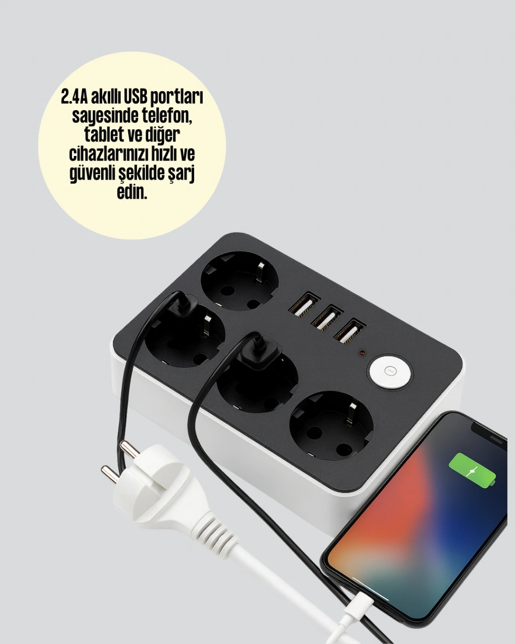 Bu çok fonksiyonlu akım korumalı priz, aynı anda hem priz hem de USB ihtiyaçlarınızı karşılamak için tasarlanmıştır. 4 adet priz çıkışı ve 3 adet USB portu ile toplamda 7 farklı cihazı aynı anda çalıştırabilir veya şarj edebilirsiniz. USB çıkışları 4.1A hızlı şarj desteği sunarak telefon, tablet ve diğer akıllı cihazlarınızı adaptör kullanmadan, yalnızca şarj kablonuz ile hızlıca şarj etmenize imkân tanır. Akım koruma özelliği sayesinde cihazlarınızı ani voltaj değişimlerine, dalgalanmalara ve elektriksel gürültülere karşı güvenle kullanabilirsiniz. 2 metre kablo uzunluğu, cihazınızı dilediğiniz yerde kullanma kolaylığı sağlar. 2500W güce kadar destek sunan bu priz, evinizde, ofisinizde veya seyahatlerinizde en güvenilir elektrik çözümünüzdür. Anahtarlı tasarımı ile kullanılmadığında enerjiyi kesebilir, ekstra güvenlik sağlayabilirsiniz. Kompakt boyutu ve hafif yapısı sayesinde her ortamda kolayca taşınabilir. Hem güvenlik hem de hız isteyenler için ideal bir seçimdir.