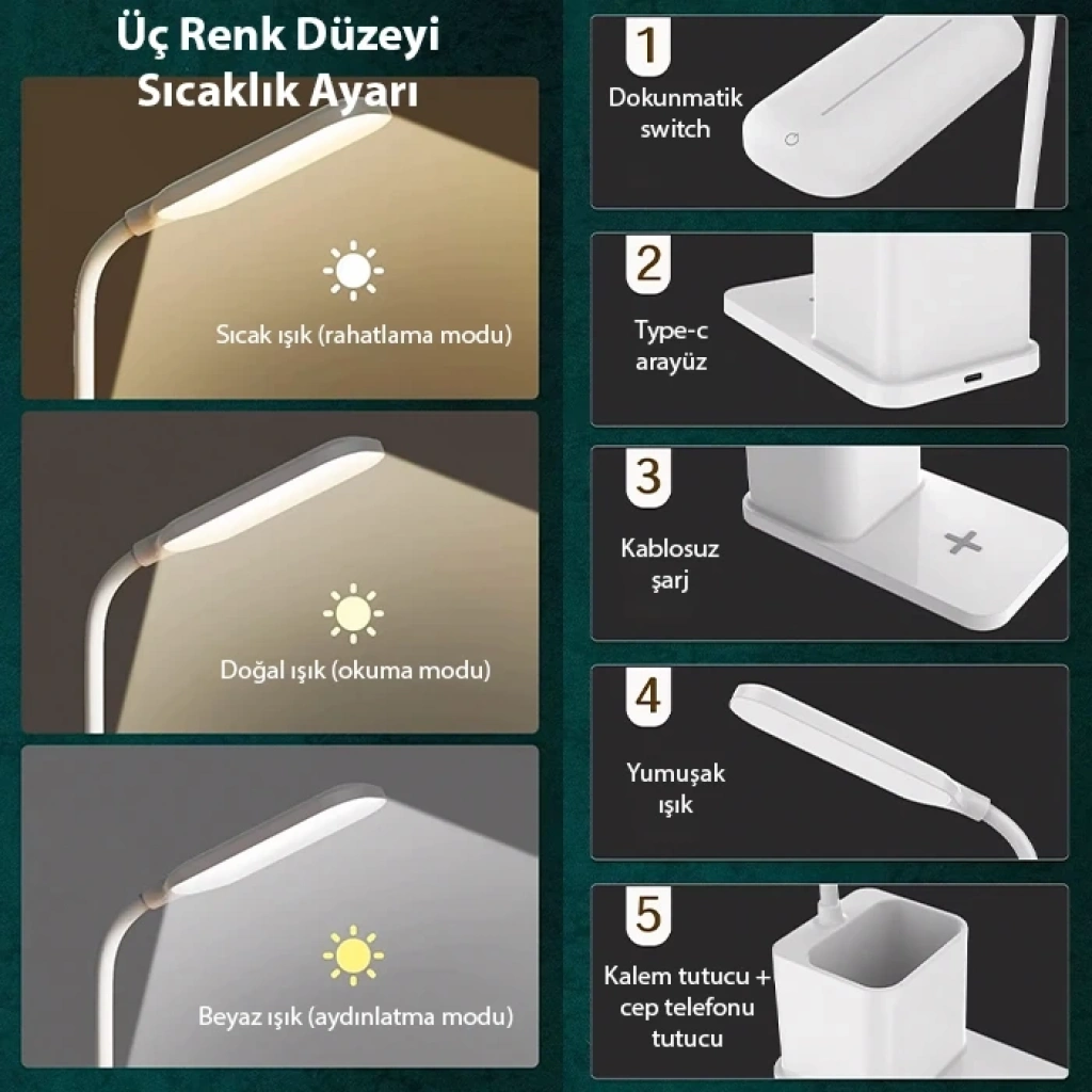 ALLY Kablosuz sarj Göz Korumali Portatif Led Masa Lambasi Kalemlik