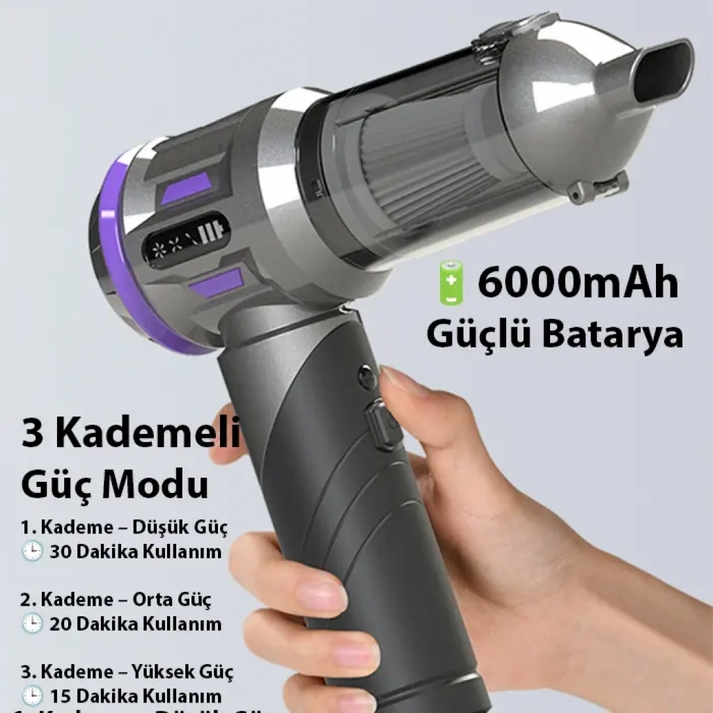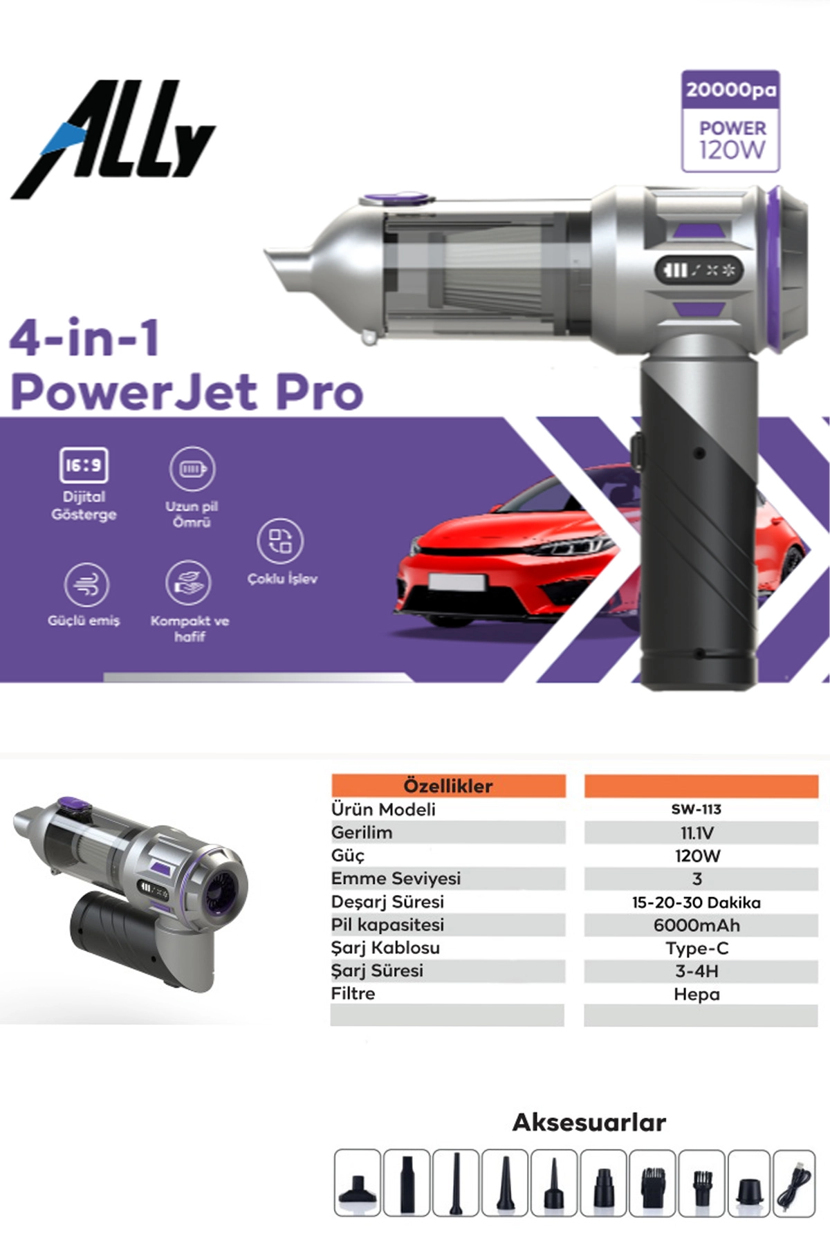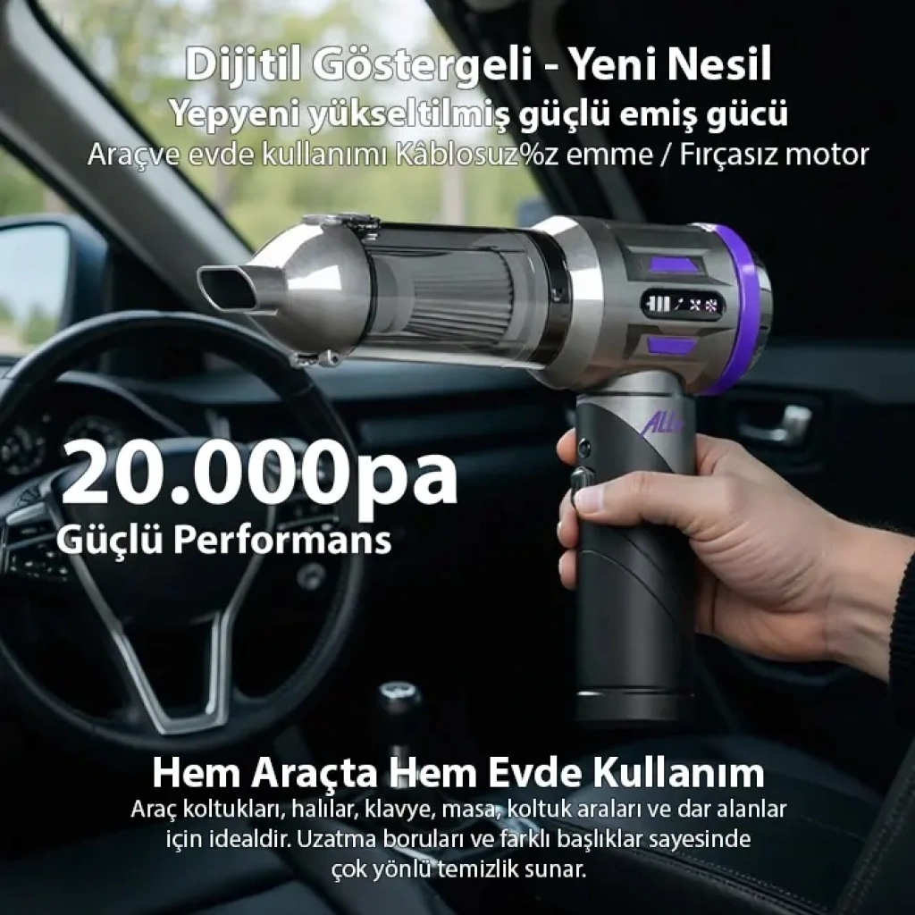 ALLY PowerJet Pro, yeni nesil motor teknolojisi ve çok amaçlı kullanım özellikleriyle araç içi, ev ve ofis temizliğinde güçlü ve pratik bir çözüm sunar. 20000Pa emiş gücü, 120W fırçasız motoru ve 6000mAh bataryası sayesinde derinlemesine temizlik sağlar.