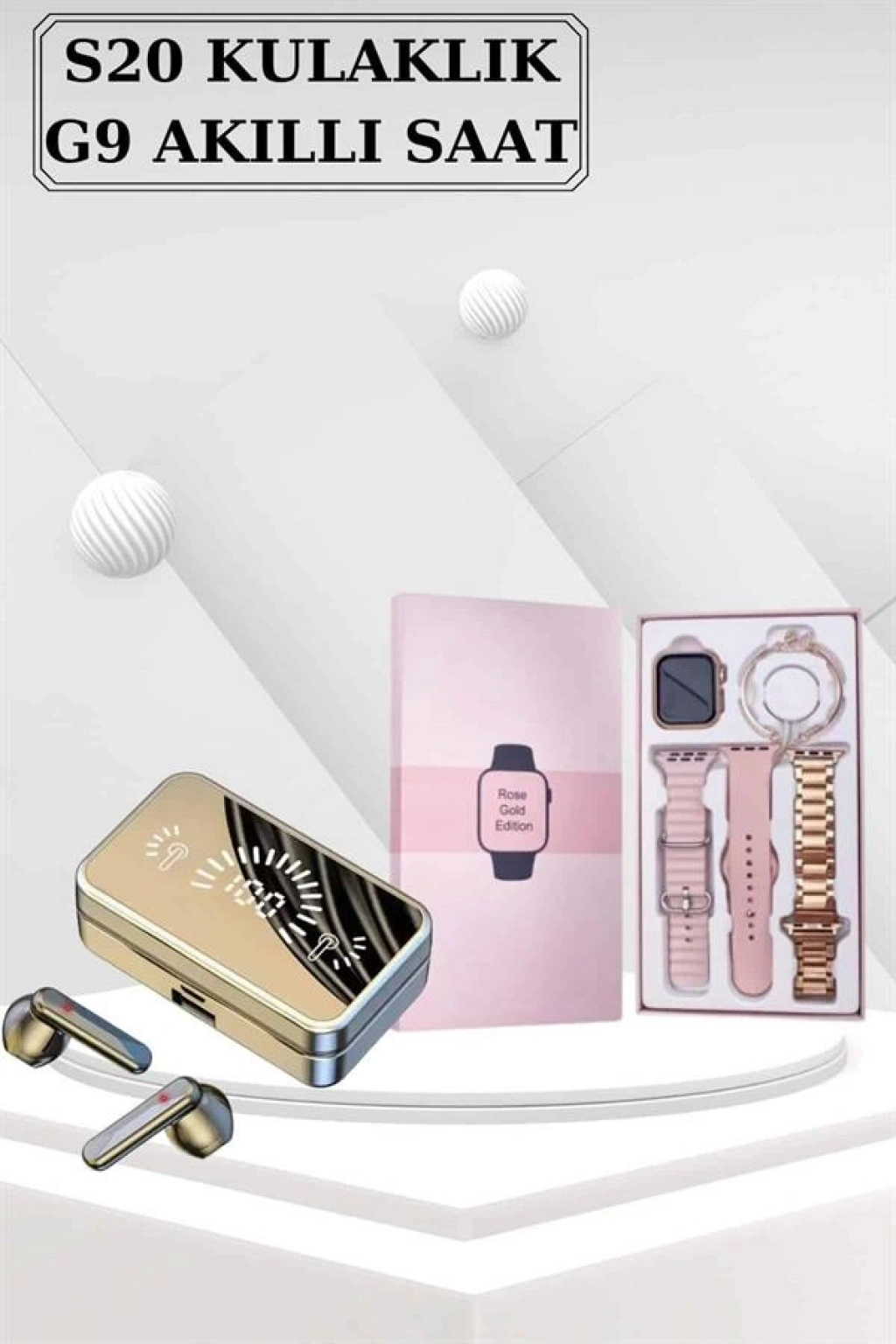 AKILLI SAATYeni Nesil Mini Kadın Akıllı Saat, şıklığı ve fonksiyonelliği bir araya getiren tasarımıyla kadınlar için ideal bir seçenek sunuyor. Almanya üretimi ultra dayanıklı model, özel wireless şarj özellikleriyle öne çıkıyor ve Türkçe menüsü sayesinde kullanıcı dostudur. Kutu içeriğinde, mini akıllı saat, 3 farklı kordon, hediye bileklik, wireless şarj kablosu ve kullanım kılavuzu bulunmaktadır. Şık pembe kutusu, hediye olarak tercih edilmesini sağlayan bir özellik taşır. 41 mm kavisli oval kenarlı yeni tasarımı ve 1,70 inç AMOLED ekranı ile yüksek çözünürlükte HD görüntü sağlar.Saat, nabız ölçer, uyku izleyici, kan basıncı, tansiyon, EKG ve vücut sıcaklığı ölçer gibi sağlık izleme özellikleriyle sağlığınızı takip etmenizi sağlar. 117 farklı spor modu ve adım, kalori, kalp ritmi ölçme gibi özellikler ile aktivite takibini oldukça detaylı yapabilirsiniz. Ayrıca akıllı hatırlatıcılar sayesinde su içme ve hareketsizlik gibi hatırlatmalar alabilir, tüm bildirimleri ve mesajları anında saatinizde görebilirsiniz.Bluetooth bağlantısı ile yüksek kaliteli müzik dinleyebilir ve uzaktan fotoğraf çekme özelliği ile fotoğraflarınızı kolayca çekebilirsiniz. Suya dayanıklı yapısı, günlük kullanımda sıklıkla tercih edilmesini sağlar; ancak deniz ve havuz gibi basınçlı suya karşı su geçirmez.Saatin sunduğu diğer özellikler arasında Türkçe ve çoklu dil desteği, saatimi bul, telefonumu bul, alarm, kronometre, hava durumu, hesap makinesi gibi fonksiyonlar bulunur. Kordonu değiştirilebilir, bu sayede kişisel tercihlere göre tasarımı özelleştirilebilir. 24 ay garanti süresi ile kullanıcılarına güvenli bir deneyim sunar.KULAKLIKTelefonu şarj etme özelliğine sahip olan bu kulaklık, çift dijital gösterge sayesinde pil seviyesini anlık olarak takip etme imkanı sunar. Güçlendirilmiş bass özelliği ile müzik deneyiminizi üst seviyeye taşırken, konuşmalarda gürültü önleyici fonksiyonu sayesinde sesinizin karşı tarafa net bir şekilde iletilmesini sağlar.Bluetooth 5.0 teknolojisi ile 10 metreye kadar kesintisiz bağlantı sunan kulaklık, IPX5 su geçirmezlik seviyesine sahip olan model, hafif su sıçramalarına karşı dayanıklıdır. 50mAh kulaklık pili ve 2000mAh şarj çantası ile donatılan ürün, 5-6 güne kadar kullanım süresi sunar. Yaklaşık 4-5 saat içinde tamamen şarj olan kulaklık, tekli veya çiftli kullanım modlarını destekler.Dokunmatik kontrol özellikleri sayesinde müzik çalma/duraklatma ve çağrı cevaplama işlemlerini kolayca gerçekleştirebilirsiniz. iOS güç göstergesi ve sesli komut istemi gibi ek fonksiyonlarla donatılmış olan bu model, şık siyah tasarımı ile dikkat çeker. Paket içeriğinde 2 adet Bluetooth kulaklık, 1 adet şarj kutusu, 1 adet şarj kablosu ve 1 adet kullanım kılavuzu bulunmaktadır.