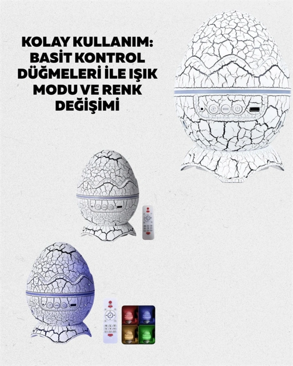 Bu çok amaçlı gece lambası, dikkat çekici dinozor yumurtası tasarımı ile estetik bir görünüm sunarken, işlevsel yapısıyla yaşam alanlarına değer katar. Ürün, 13.5 × 13.5 × 18 cm boyutlarındadır ve yalnızca 402 gram ağırlığındadır. ABS ve PVC malzemeden üretilmiş olup hem hafif hem dayanıklıdır. 5V 1A USB kablosu (1 metre) ile şarj edilebilir. Yüksek kaliteli COB LED’lerle donatılan projektör; beyaz, mavi, kırmızı gibi 7 farklı renk seçeneği sunar. Çocuk odası, oturma odası veya yatak odasında kullanıma uygundur.