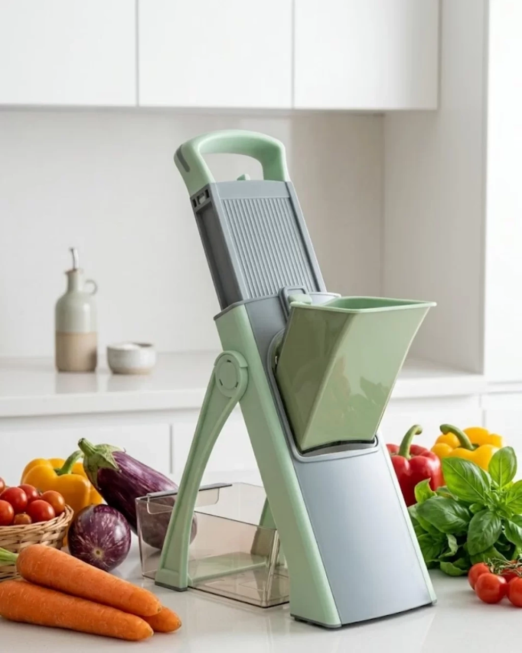 Paslanmaz çelikten üretilmiş bu el rendesi, sağlamlığı ve güvenli yapısıyla mutfakta uzun süreli kullanım sunar. Dayanıklı çelik gövde, günlük doğrama ve dilimleme işlemlerinde yüksek performans sağlar. Keskin ve paslanmaz bıçaklar, farklı sebze ve meyveleri kolayca işlemenize yardımcı olur.Üstte yer alan bastırma aparatı, kullanıcıya kontrollü ve dengeli bir doğrama deneyimi sunar. Bu yapı sayesinde eliniz doğrudan bıçaklarla temas etmez ve güvenli kullanım ön planda tutulur. Ergonomik tasarım, hem sağ hem sol el kullanımına uygundur.Katlanabilir kompakt tasarım, ürünü kullandıktan sonra rahatça saklamanızı sağlar. Temizlik fırçası, bıçak aralarında kalan parçaları zahmetsizce temizlerken, yiyecek toplama kabı mutfak tezgâhının dağılmasını önler. Şık ve modern görünümüyle mutfağınıza estetik bir katkı sağlar.