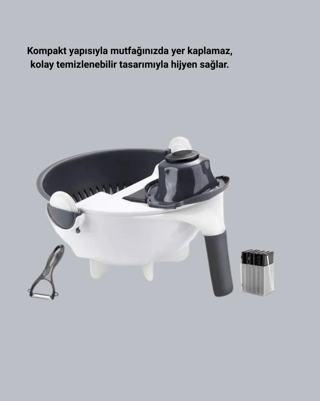 Mutfakta işlerinizi hızlandırmak ve çok daha düzenli bir çalışma alanı oluşturmak istiyorsanız, 5 Fonksiyonlu Döner Süzgeçli Rende tam size göre bir üründür. Hem profesyonel mutfaklarda hem ev kullanıcılarında tercih edilen bu cihaz, birçok işlemi tek üründe birleştirerek büyük kolaylık sunar.Döner mekanizması, farklı kesim bıçaklarını anında değiştirmenize imkân tanır. Böylece tek bir cihazla hem ince hem kalın rendeleme, hem şerit kesme hem de yuvarlak dilimleme yapabilirsiniz. Bu özellik, özellikle yemek hazırlığı sırasında zaman kaybını önler ve mutfakta daha verimli çalışmanıza yardımcı olur.Hazne kısmı, doğranan yiyeceklerin dağınıklık oluşturmamasını sağlar. Ayrıca bu hazne süzgeç görevi de görür; sebzeleri doğradıktan sonra hemen su altında yıkayabilir ve pratik şekilde süzebilirsiniz. Bu çift fonksiyon, mutfakta kullanılan araç sayısını azaltarak işlerinizi kolaylaştırır.Kullanım güvenliği için tasarlanmış kaymaz taban, ürünün sabit durmasını sağlar ve işlem sırasında kaymasını engeller. El koruma aparatı ise bıçaklara yakın çalışırken maksimum güvenlik sunar. Bu sayede olası kesiklerin önüne geçilir.Ürünün kompakt tasarımı yer kaplamaz ve saklamayı kolaylaştırır. Parçalarının kolayca ayrılabilir olması, temizlik sürecini oldukça pratik hale getirir. İster elinizde yıkayın ister su altında durulayın, hijyenik kullanım her zaman mümkündür.Paslanmaz çelik bıçakları uzun süre keskinliğini korur ve yüksek performans sunar. Sağlam plastik gövde, gıda ile temasa uygun yapıda olup sağlıklı bir kullanım sağlar. Ürün, salata hazırlama, sebze doğrama, sos hazırlama, garnitür kesme ve daha birçok mutfak işleminde hızlı bir yardımcıdır.Bu 5 fonksiyonlu döner rende, mutfakta pratiklik ve düzen arayan herkes için vazgeçilmez bir araçtır.