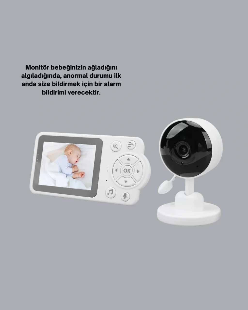 Görüntülü ve sesli bebek monitörü, ebeveynlerin bebeklerini güvenle izleyebilmesi için tasarlanmıştır. 2.8 inç ekran, gece görüş, ağlama algılama ve sıcaklık ölçümü gibi özellikleri bir arada sunar. Ninni fonksiyonu bebeği sakinleştirir. Alarm ve saat fonksiyonları günlük düzeni destekler.Kablosuz ve taşınabilir yapısı sayesinde ev içinde rahatlıkla kullanılabilir. Bebek odası için ideal bir güvenlik ve takip çözümüdür.