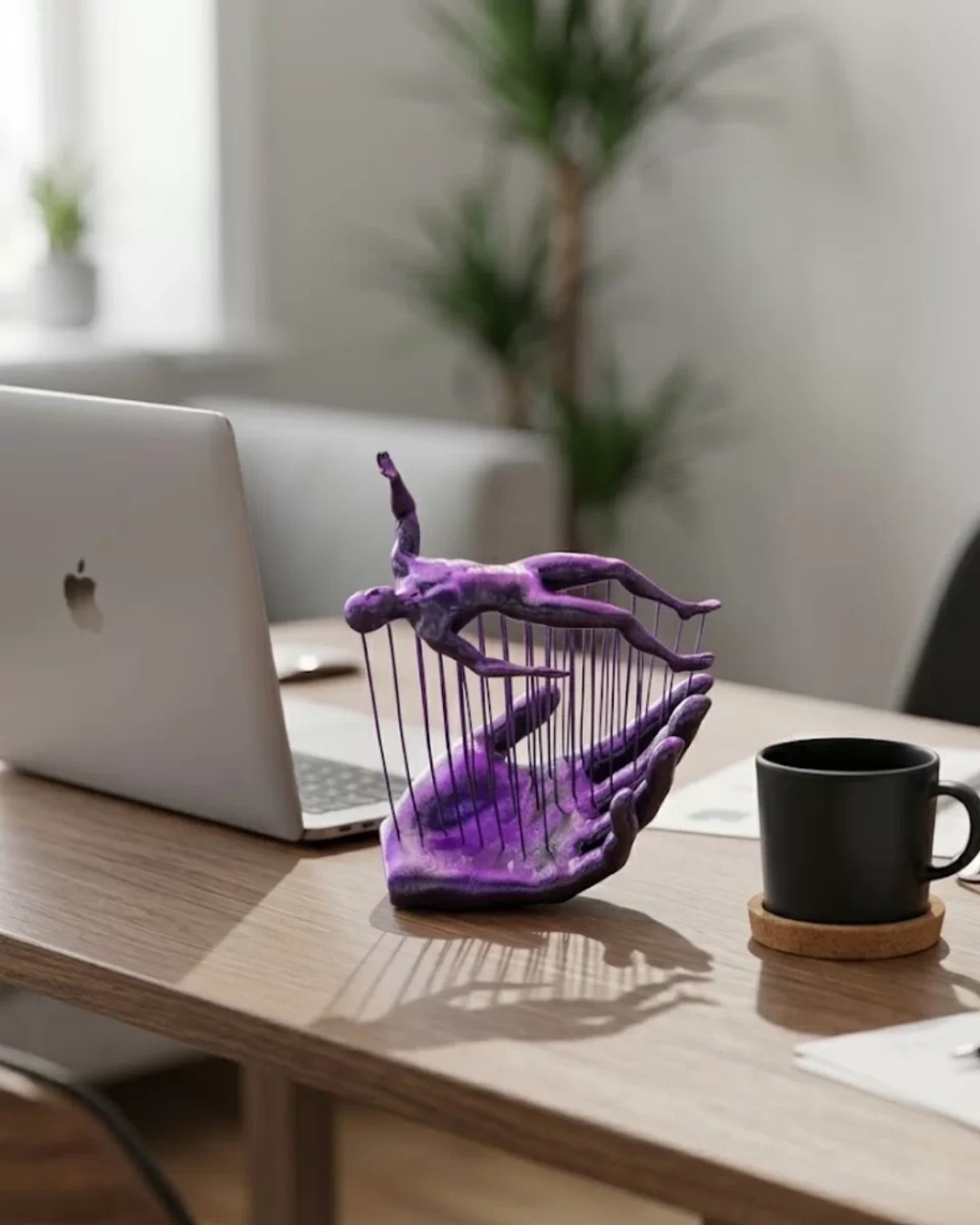 Modern dekorasyon anlayışına sanatsal bir dokunuş katmak isteyenler için tasarlanan bu 3D insan figürü, estetik görünümü ve dikkat çekici tasarımı ile bulunduğu ortama farklı bir atmosfer kazandırır. Mor tonlarının etkileyici geçişleri ile hazırlanan bu özel tasarım, klasik dekor ürünlerinden sıkılan kullanıcılar için ideal bir alternatif sunar.Ürün, üç boyutlu yapısı sayesinde sıradan dekoratif objelerden ayrılır ve bulunduğu ortamda derinlik hissi oluşturur. İnsan figürü formunda tasarlanmış olması, sanatsal ve anlam yüklü bir görünüm sağlar. Özellikle modern, minimal ve çağdaş dekorasyon stilleri ile mükemmel uyum sağlar.Kompakt boyutları sayesinde masa üstü, raf, konsol veya çalışma alanlarında rahatlıkla kullanılabilir. Aynı zamanda duvar dekoru olarak da değerlendirilebilir. Bu yönüyle çok yönlü bir kullanım imkanı sunar. Ev, ofis, stüdyo veya kişisel alanlarda estetik bir tamamlayıcı olarak tercih edilebilir.Dayanıklı malzemeden üretilmiş olan bu ürün, uzun süre formunu koruyacak şekilde tasarlanmıştır. Hafif yapısı sayesinde kolayca taşınabilir ve yer değiştirilebilir.Dekorasyonda farklılık yaratmak isteyenler için hem şık hem de özgün bir seçenektir. Minimal ama etkileyici tasarımı ile bulunduğu ortama karakter kazandırır.