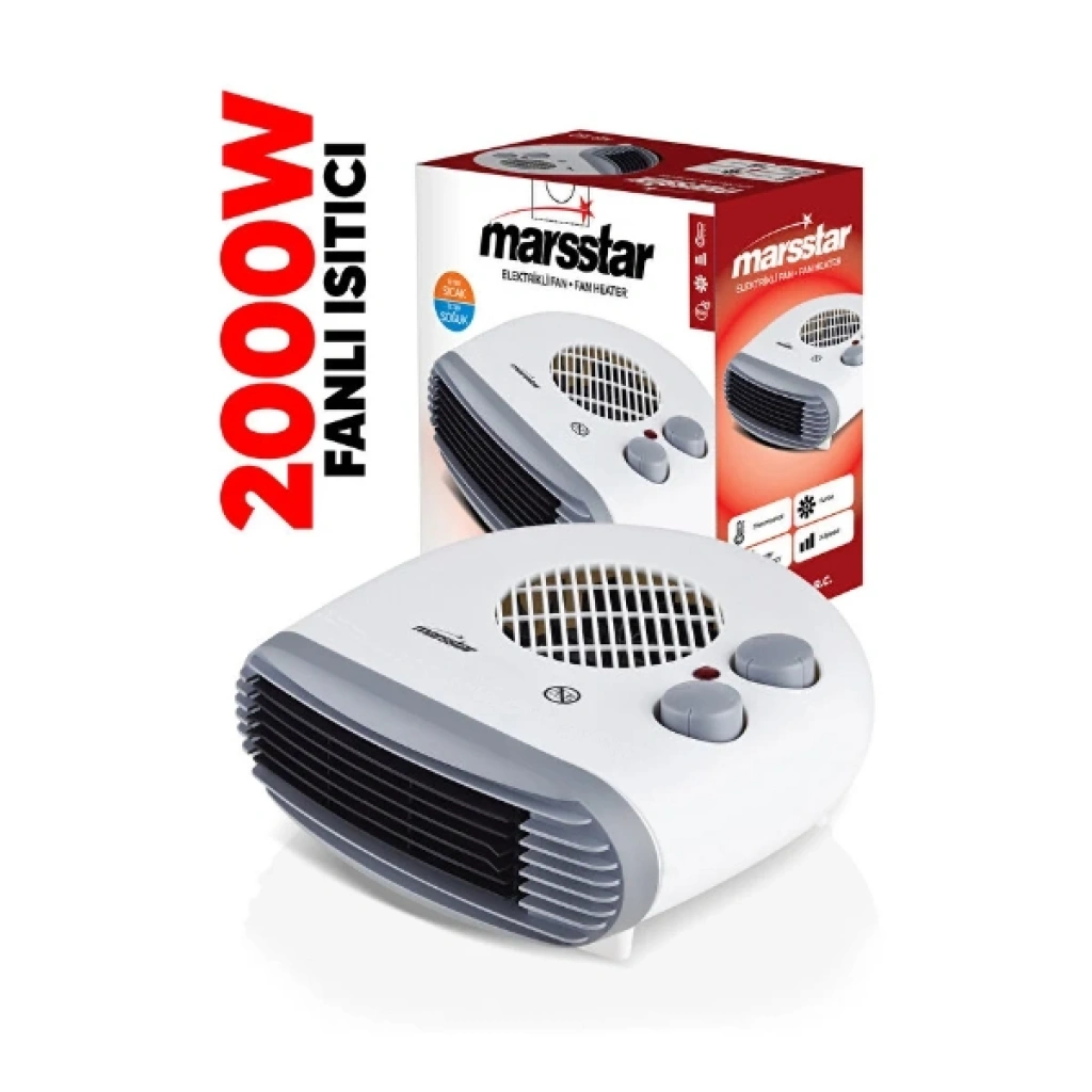 ELEKTRİKLİ ISITICI FANÜrün ÖzellikleriElektrikli Isıtıcı Fan, dört mevsim kullanım için tasarlanmış pratik ve güçlü bir ısıtma–soğutma çözümüdür. 2000W yüksek ısıtma kapasitesi sayesinde bulunduğu ortamı kısa sürede ısıtarak kış aylarında hızlı ve konforlu bir sıcaklık sağlar. Ayarlanabilir termostat özelliği, ortam sıcaklığını dilediğiniz seviyede tutmanıza imkân tanırken iki kademeli ısıtma gücü ile ihtiyaca göre düşük veya yüksek performans seçeneği sunar.Yaz aylarında kullanılabilen soğuk üfleme modu, ürünü dört mevsim işlevsel hale getirir. Devrilme emniyet sistemi sayesinde cihaz devrilme anında otomatik olarak kapanarak güvenli kullanım sağlar. Hafif ve taşınabilir yapısı, evden ofise her ortamda rahatça kullanılabilmesine olanak tanır. Sessize yakın çalışma performansı, yatak odası, salon veya çalışma odasında konforlu bir deneyim sunar.Modern tasarımıyla mekânlara uyum sağlayan bu ısıtıcı fan, kışın sıcak, yazın serin bir hava akımı sunarak tüm yıl boyunca yanınızda olur.Paket İçeriği1 Adet Elektrikli Isıtıcı Fan