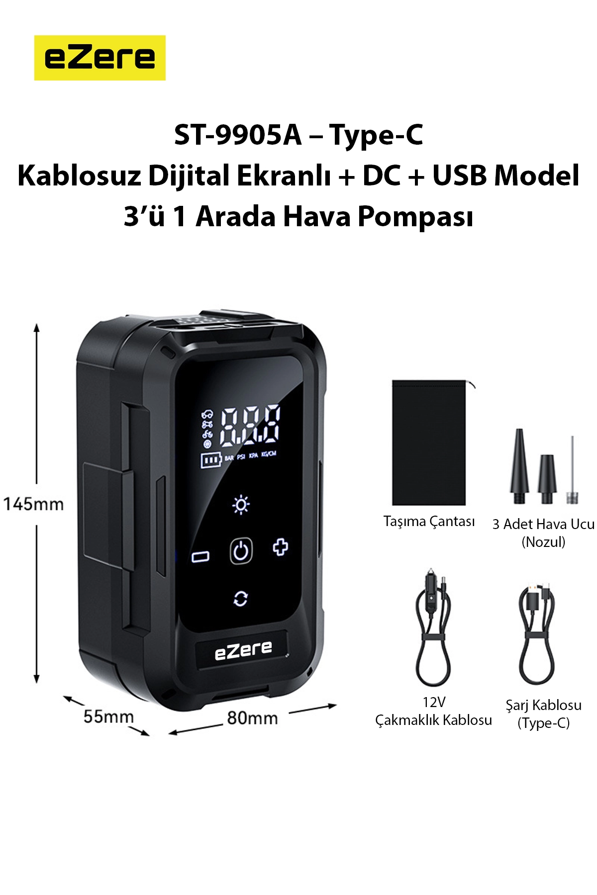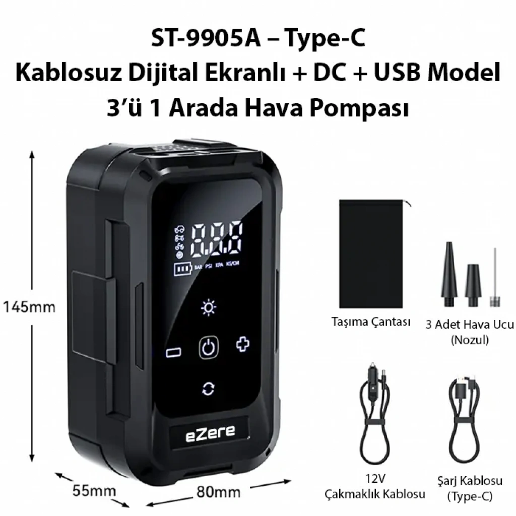 eZere ST-9905A, güçlü motoru ve kablosuz tasarımıyla araç, motosiklet, bisiklet ve şişme ürünler için hızlı, pratik ve güvenli şişirme imkânı sunar. Geliştirilmiş basınç sistemi sayesinde 0–140 PSI aralığında hassas şişirme yapabilir.