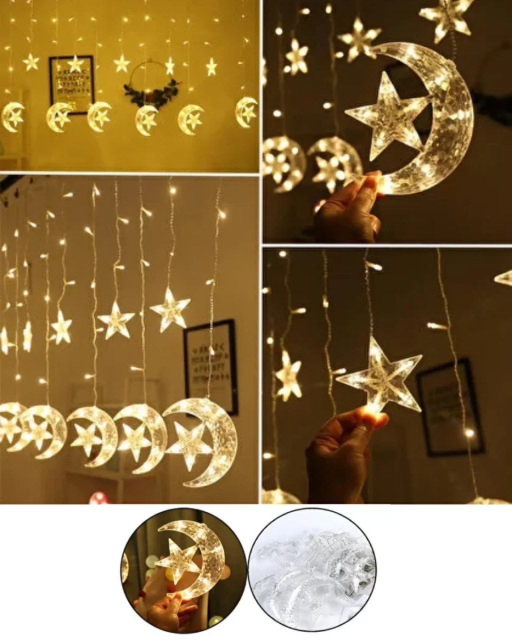 Hilal ve yıldız figürlü dekoratif perde ışık, yaşam alanlarınıza sadece bir aydınlatma değil, aynı zamanda duygusal bir ambiyans kazandırır. Sıcak beyaz tonuyla karanlık ortamda yumuşak ve romantik bir ışık yayarak bulunduğu mekâna huzurlu bir atmosfer oluşturur. Özellikle akşam saatlerinde tül perde önünde, pencere kenarında ya da duvar fonunda kullanıldığında ortama masalsı bir görünüm kazandırır.İki farklı aydınlatma modu sayesinde ister sabit ışık, ister yanıp sönen efekt tercih edebilirsiniz. Sabit mod daha sakin ve sofistike bir görünüm sunarken, yanıp sönen mod özel günlerde ve davetlerde enerjik bir hava oluşturur. Böylece ürünü hem günlük dekorasyonda hem de özel organizasyonlarda rahatlıkla kullanabilirsiniz.Yüksek kaliteli plastik gövde ve PVC kaplamalı kablo yapısı sayesinde hem dayanıklı hem de güvenlidir. Isıya karşı dirençli tasarımı sayesinde uzun süre açık kaldığında bile güvenli kullanım sağlar. Şık hilal ve yıldız tasarımı, modern ve geleneksel dekorasyon stilleriyle uyum sağlar.Ev, balkon, teras, restoran, vitrin, organizasyon alanları ve özel gün süslemelerinde rahatlıkla tercih edilebilir. Dekoratif yapısı sayesinde bulunduğu ortamı anında daha estetik ve sıcak bir görünüme kavuşturur.
