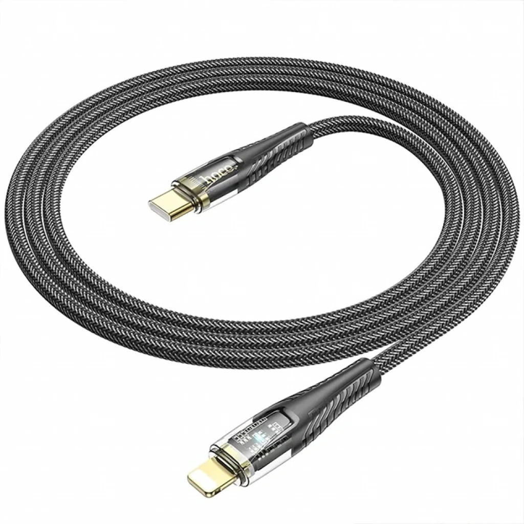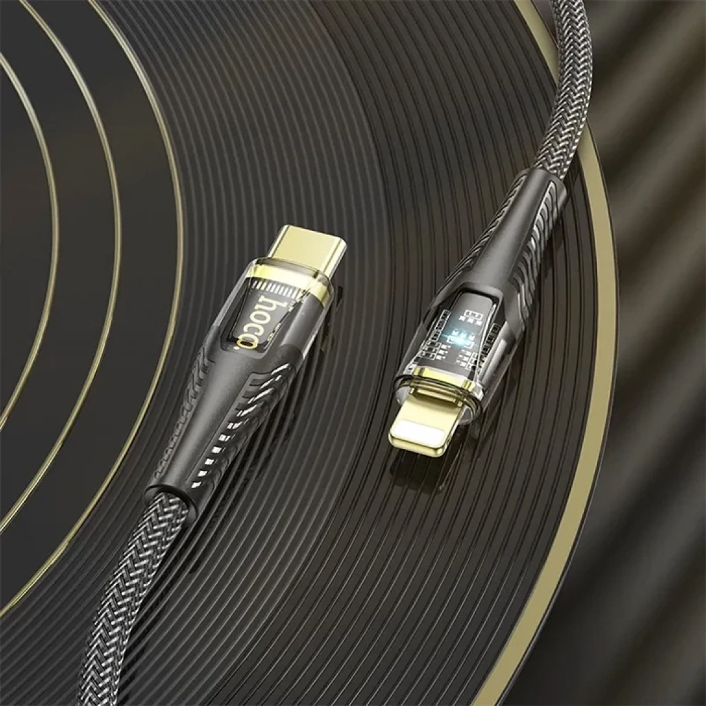 HOCO U121 Gold standard Transparent Discovery Edition 60W Type-C to iPhone Lightning Hızlı ŞarjŞarj ve veri aktarımı-Hızlı Şarj teknolojisi-Saf Bakır tel Çekirdek-Ekstra Dayanıklılık-Yarı Saydam Kabuk 1, uzunluk: 1,2 m; ağırlık: 35g2, dış malzeme: örgülü iplik3, bağlantı malzemesi: PVC4, kablo çekirdeği: (34/0,1)*2+(16/0,08)*3 OD4,2mm5, Apple PD 27W hızlı şarjı destekler