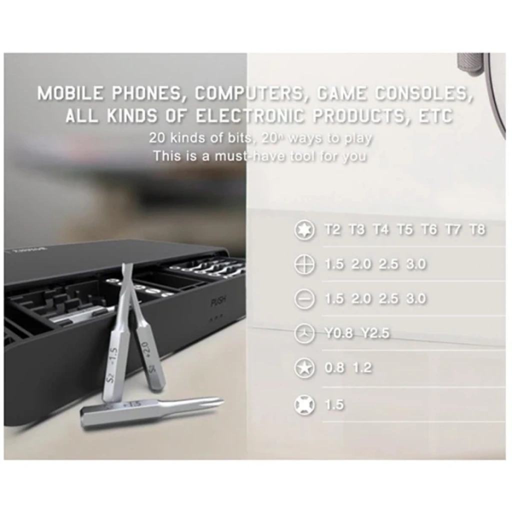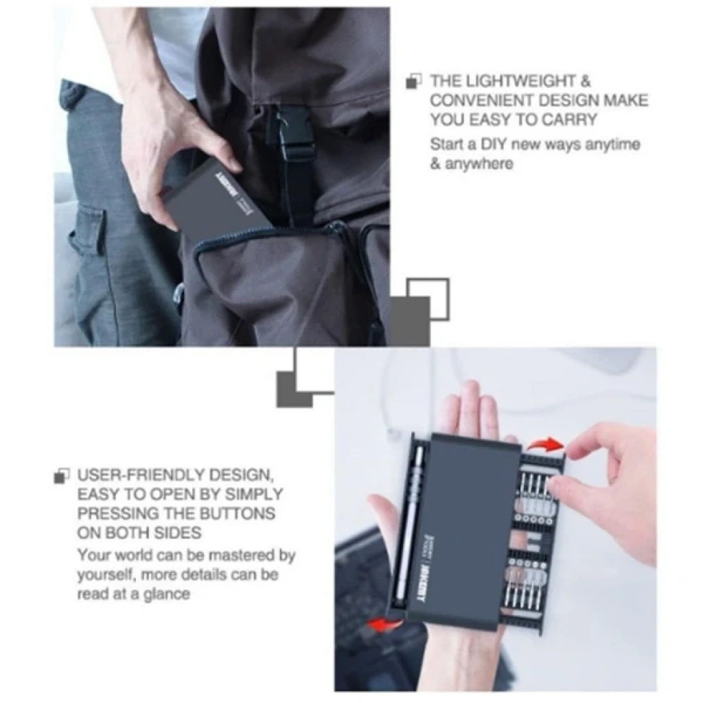 Hafif alüminyum alaşım sap, kolay taşınabilir ve ergonomik tasarıma sahip JM-8170 Bit Set hassas bir tamir setidir.