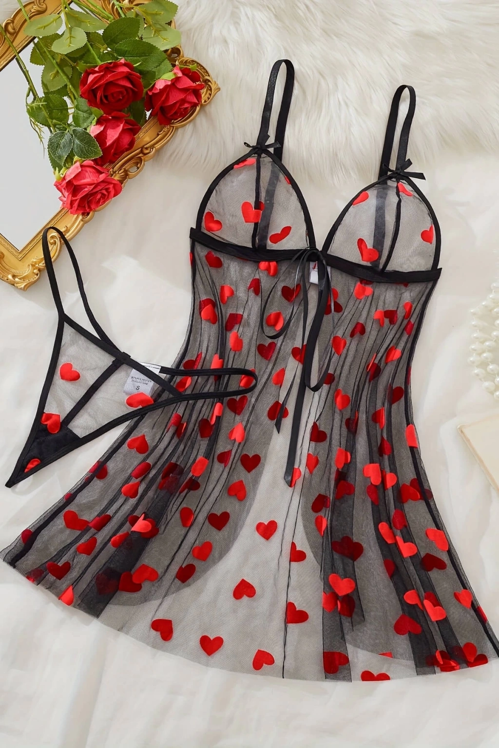Nevamel® Kalp Desenli Siyah Transparan Gecelik TM1378