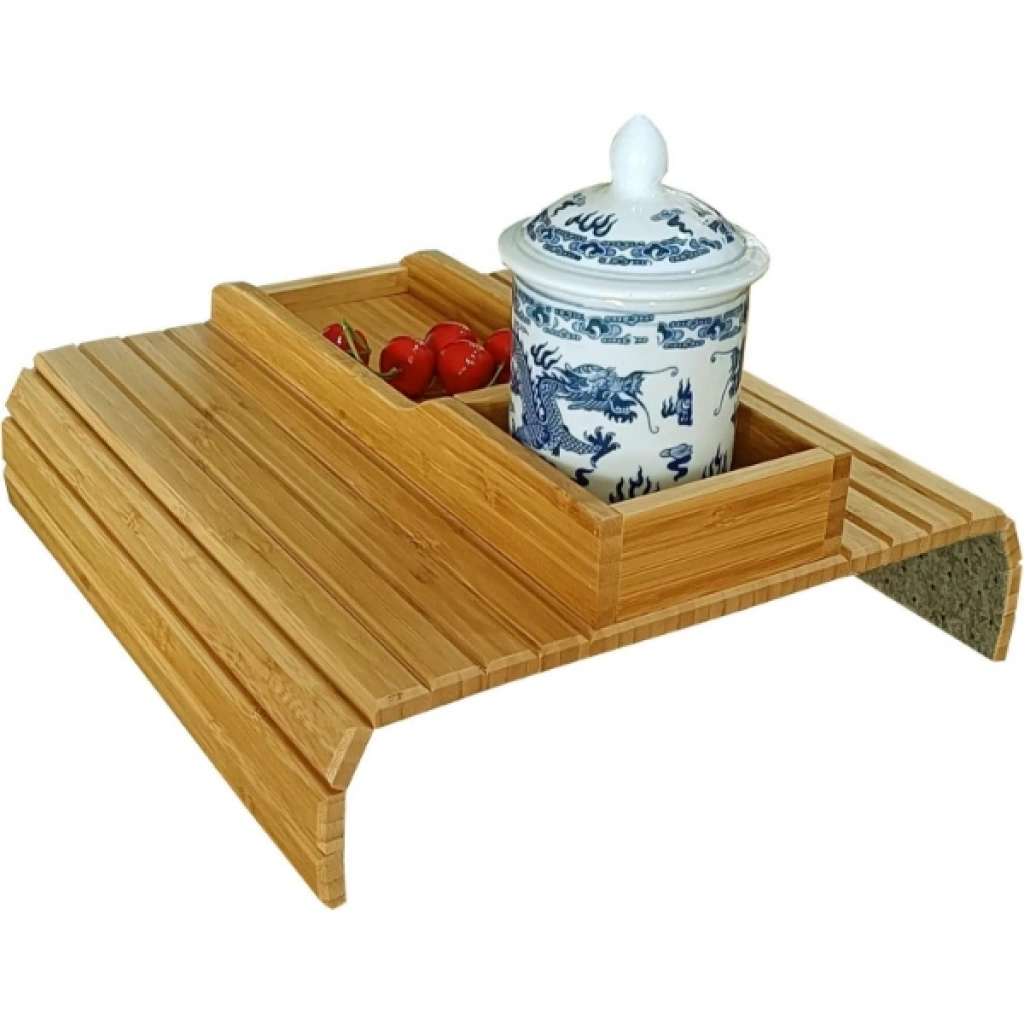 KATLANABİLİR AHŞAP KANEPE TEPSİSİÜrün ÖzellikleriKatlanabilir ahşap kanepe tepsisi, bambu görünümlü dayanıklı ahşap yapısıyla estetik ve işlevselliği bir arada sunar. Kanepe kolçaklarına kolayca yerleştirilebilen bu pratik ürün, alt kısmında bulunan kaydırmaz yüzeyi sayesinde güvenli kullanım imkânı sağlar. Üzerine telefon, kumanda, kitap, çay veya kahve kupası yerleştirilebilir ve koltuk kenarında düzenli bir alan yaratır. Katlanabilir yapısı sayesinde kolayca saklanabilir ve taşınabilir. Doğal görünümü ile ev dekorasyonunuza uyum sağlar. Hem pratik bir yardımcı hem de şık bir tamamlayıcıdır.41,5 x 33,5 cm ölçülerinde olup 1 cm kalınlığa sahiptir.Paket İçeriği1 adet Katlanabilir Ahşap Kanepe Tepsisi