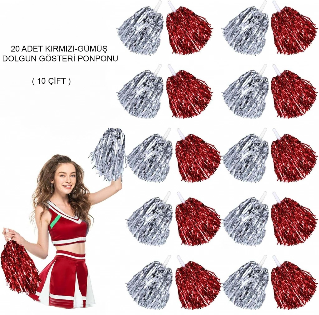 KIRMIZI GÜMÜŞ METALİK DOLGUN GÖSTERİ PONPONU - 20 ADET (10 ÇİFT)Ürün ÖzellikleriKırmızı gümüş metalik dolgun gösteri ponponu seti, yüksek parlaklık sağlayan metalik yapısı ve dolgun formu sayesinde sahne performanslarında güçlü bir görsel etki oluşturmak için tasarlanmıştır. Kırmızı ve gümüş renklerin kontrast uyumu, ışık altında dikkat çekici bir yansıma sunarak amigo gösterileri, cheerleading performansları, dans şovları ve toplu organizasyonlarda hareketleri daha net ve enerjik gösterir. Dolgun yapısı sayesinde sahnede hacimli bir görünüm elde edilirken, hafif ve dayanıklı malzeme uzun süreli kullanımlarda elde yorgunluk oluşturmaz. Toplu etkinlikler için ideal olan bu set; okul gösterileri, spor organizasyonları, sahne şovları, açılışlar ve kutlamalarda profesyonel bir görünüm sağlar. Renklerin sahne ışıklarıyla uyumu, fotoğraf ve video çekimlerinde de etkileyici sonuçlar elde edilmesine yardımcı olur.Paket İçeriği20 adet Kırmızı Gümüş Metalik Dolgun Gösteri Ponponu Seti (10 Çift)