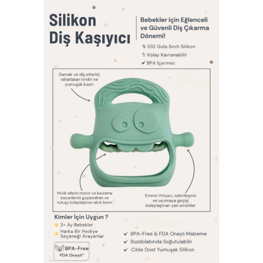 KOYU YEŞİL BEBEK SİLİKON DİŞ KAŞIYICIÜrün ÖzellikleriKoyu yeşil silikon bebek diş kaşıyıcı, diş çıkarma döneminde bebeklere hem rahatlatıcı hem de eğlenceli bir deneyim sunar. Modern tasarımı, farklı dokulara sahip yüzeyleri ve ergonomik tutma alanları sayesinde minik eller için kolay kavranabilir yapıdadır. Hassas diş etlerini nazikçe masaj yaparak yatıştırır ve bebeklerin sakinleşmesine yardımcı olur.Çift yönlü emzik kolları, bebeklerde doğal emme refleksini desteklerken parmak emme alışkanlığının önüne geçer. Aynı zamanda çene kaslarını çalıştırarak ağız ve çene gelişimine katkı sağlar. Hafif ve esnek yapısı ile bebekler kolayca tutabilir.Bu diş kaşıyıcı yalnızca rahatlatıcı değil, aynı zamanda motor ve duyusal gelişimi destekleyen bir oyun arkadaşıdır. Farklı yüzey dokuları dokunsal keşfi teşvik ederken kavrama becerisini geliştirir. Gıda sınıfı medikal silikon malzemeden üretilmiş olup BPA, BPS ve zararlı kimyasallar içermez. Yeni doğan döneminden itibaren güvenle kullanılabilir.Paket İçeriği1 adet Koyu Yeşil Bebek Silikon Diş Kaşıyıcı