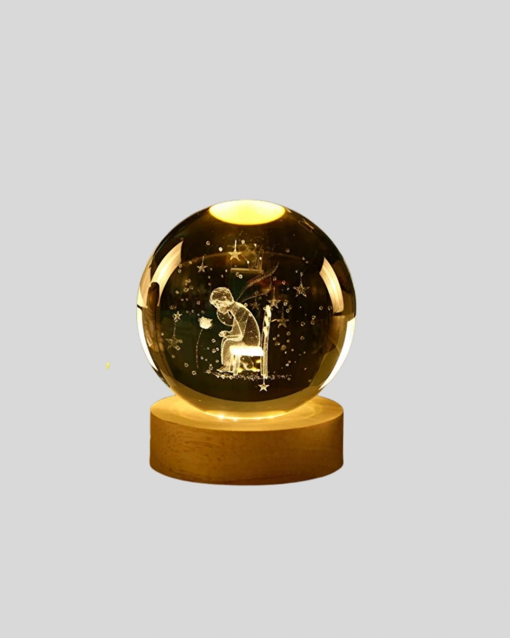 8 cm büyük boy cam küre, dekoratif boyutuyla bulunduğu ortamda güçlü bir görsel etki yaratır. Üst kısmı tamamen camdan üretilmiş olup ışığı yumuşak şekilde dağıtır. Alt kısmı ahşap malzemeden üretildiği için doğal bir görünüm sunar. Küçük Prens temalı tasarımı, özellikle modern, minimal ve nostaljik dekorasyon tarzlarıyla çok iyi uyum sağlar. Gece lambası olarak da kullanılabilir.