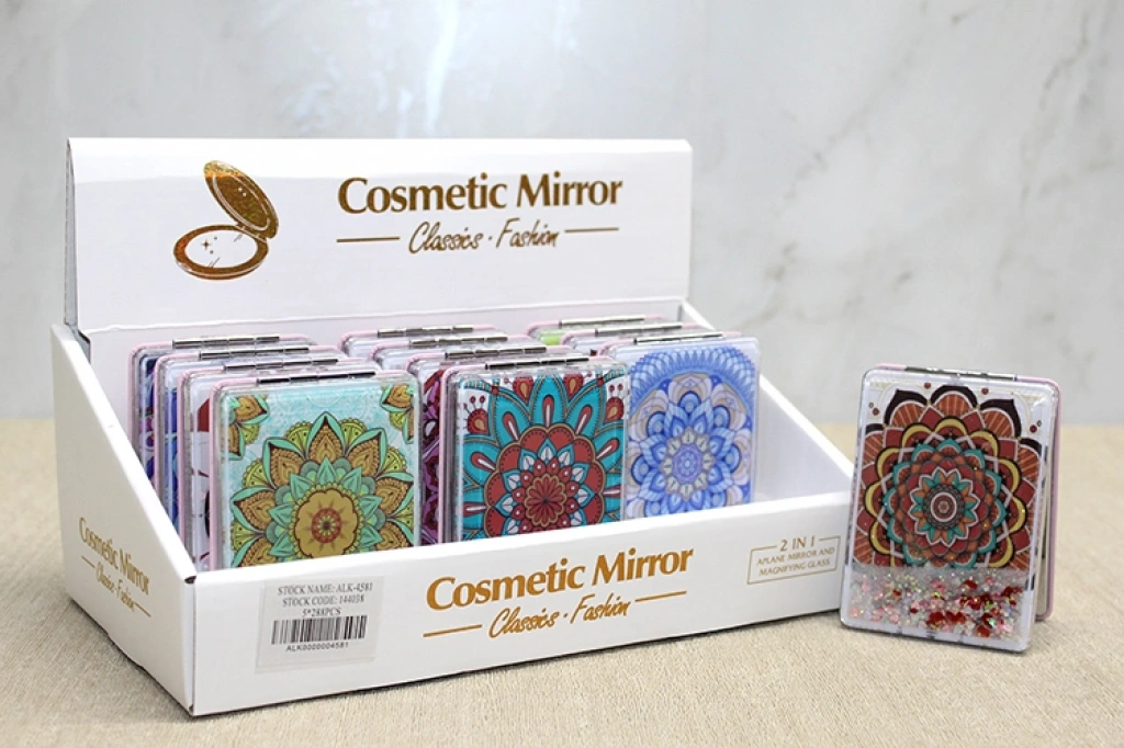 MANDALA DESENLİ HAREKETLİ SULU EL AYNASI - MODEL 4Ürün ÖzellikleriMandala Desenli Hareketli Sulu El Aynası - Model 4, dış yüzeyinde yer alan sulu ve simli kapak tasarımıyla estetik ve dikkat çekici bir görünüm sunan dekoratif bir cep aynasıdır. Mandala desenli ön yüzeyi detaylı ve sanatsal bir karakter taşırken, kapak içindeki hareketli simli sıvı yapı ürüne dinamik bir görünüm kazandırır. Klasik aynalardan ayrılan hareketli sulu simli kapak tasarımı sayesinde hem görsel hem de dekoratif açıdan farklı bir alternatif sunar. Günlük kullanım için pratik bir mandala desenli el aynası seçeneği olan bu model, kompakt yapısıyla çanta içinde rahatlıkla taşınabilir. 8,5x6 cm ölçüsü sayesinde elde kolay tutulur ve fazla yer kaplamaz. Görselde yer alan modellerden biri karışık olarak gönderilir. Zarif tasarımıyla öne çıkan bu ürün, özel günlerde tercih edilebilecek şık bir hediyelik cep aynası alternatifi sunar.Ürün Teknik ÖzellikleriÖzellikAçıklamaÜrün AdıMandala Desenli Hareketli Sulu El Aynası - Model 4Boyut8,5 x 6 cmTasarımMandala Desenli ve Sulu Simli KapakGönderimModellerden Biri Karışık Olarak GönderilirKullanım AlanıKişisel Kullanım ve HediyelikPaket İçeriği1 Adet Mandala Desenli Hareketli Sulu El Aynası - Model 4
