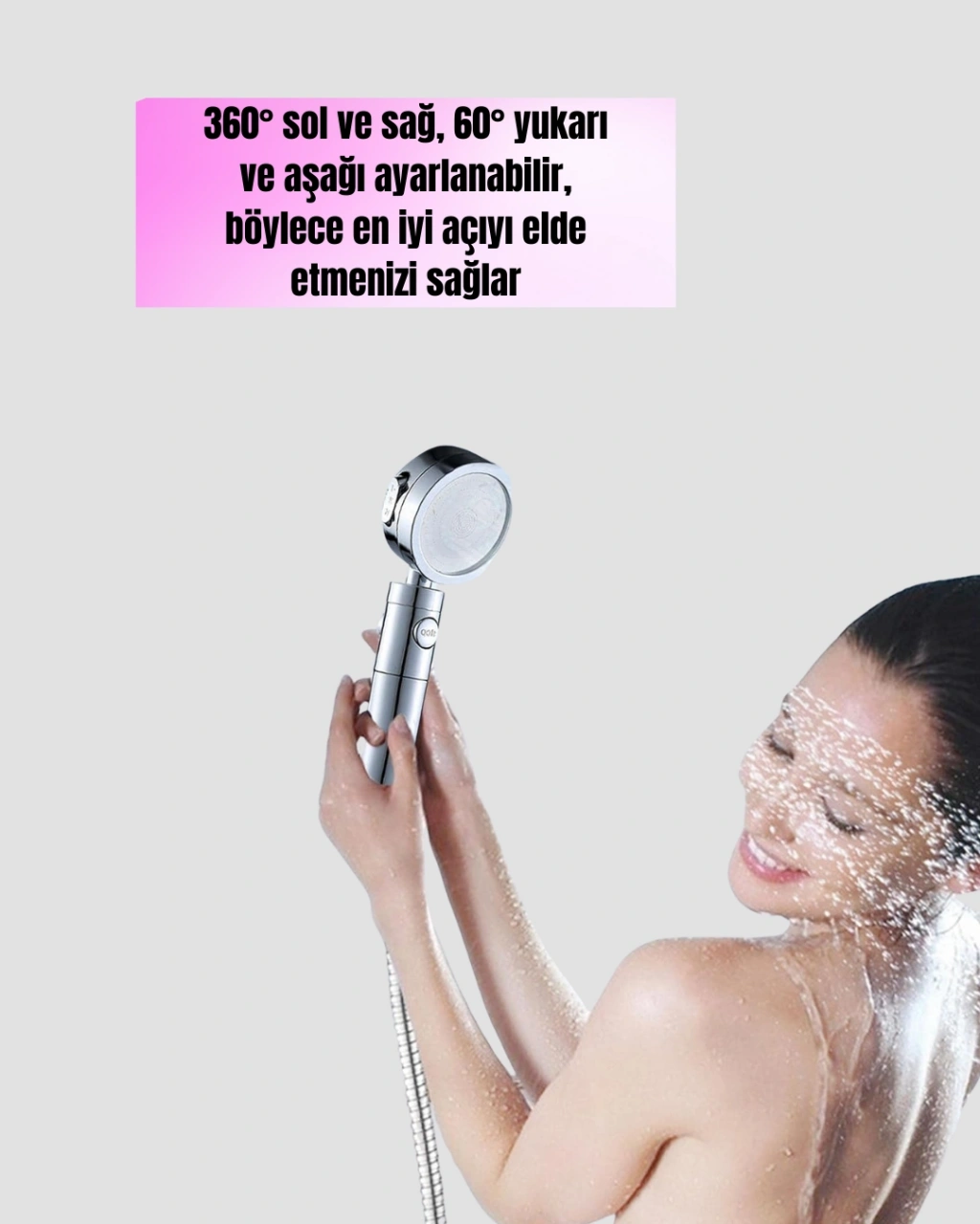 360° sağa ve sola, 60° yukarı ve aşağı ayarlanabilen esnek başlık tasarımı, duş deneyiminizi kişiselleştirmenizi sağlar. Böylece suyun yönünü rahatlıkla değiştirebilir, en uygun açıyla duş alabilirsiniz. Sağlam metal hortum somunları ve özel contalar sayesinde sızdırmazlık garantisi sunar.