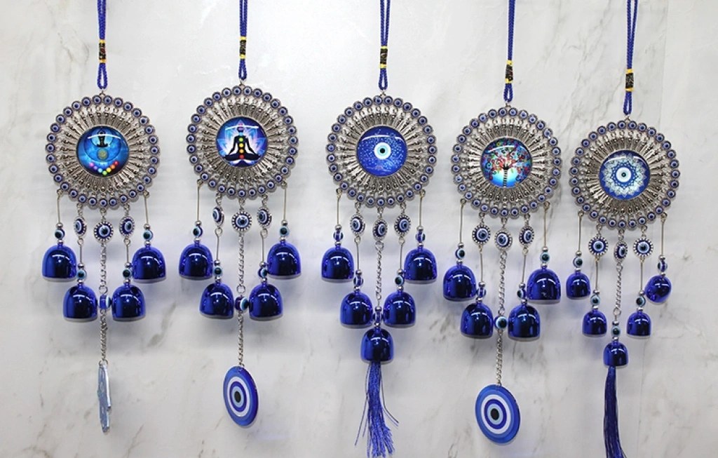 METAL NAZAR BONCUĞU ÇAN MODEL 9Ürün ÖzellikleriMetal Nazar Boncuğu Çan Model 9, şık tasarımı ve göz alıcı detaylarıyla hem dekoratif hem de mistik bir aksesuardır. Nazar boncuğu detayı sayesinde kötü enerjileri uzaklaştırdığına inanılırken, metal çanları ile ortama huzurlu bir tını yayar. Kapı, pencere, bahçe veya duvara kolayca asılabilir. Dayanıklı metal malzemeden üretilmiş olup, uzun ömürlü kullanım sunar. Mistik ve otantik havasıyla her ortama uyum sağlayan özel bir parçadır.Paket İçeriği1 Adet Metal Nazar Boncuğu Çan