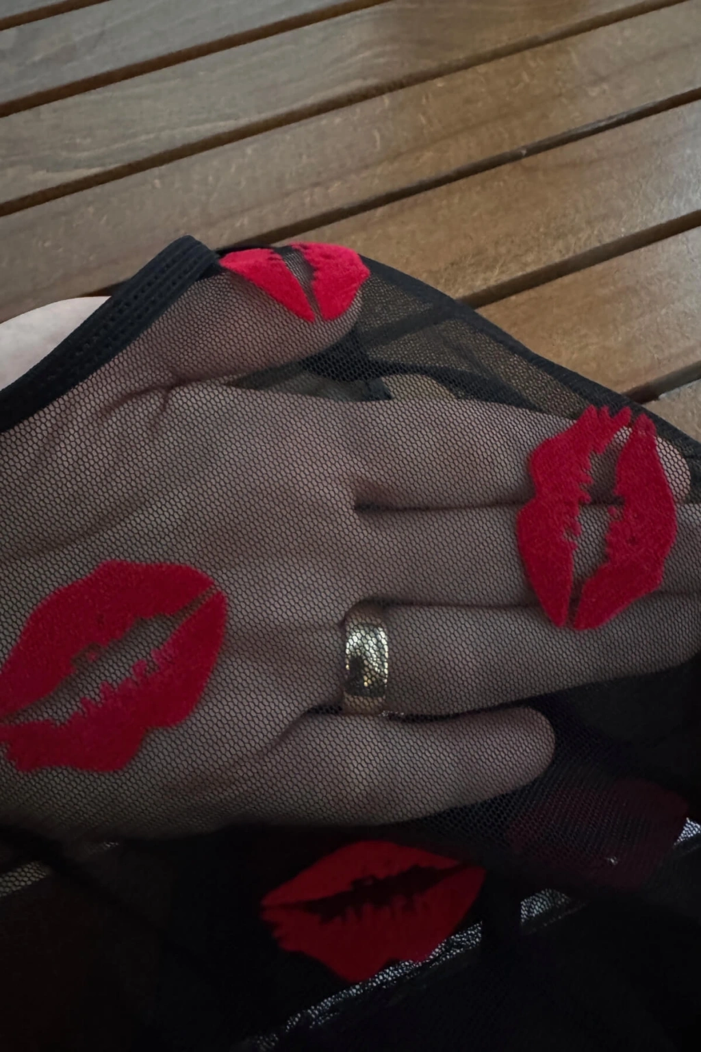 Özel tasarım dudak desenli fantazi body; romantik, cesur ve dikkat çekici iç giyim seven kadınlar için idealdir.