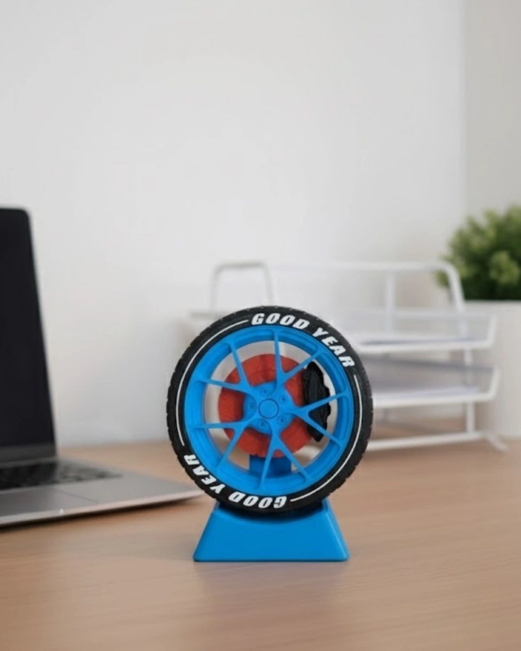 Otomobil jant görünümlü masa üstü dekor, özellikle araba meraklıları için tasarlanmış şık bir ofis aksesuarıdır. Çalışma masasının üzerinde konumlandırıldığında sade ofis düzenine sportif ve dinamik bir hava katar. Dengeli tabanı sayesinde sabit durur ve devrilme yapmaz. Ofis, home office, atölye veya showroom ortamlarında dekoratif amaçla kullanılabilir. Minimal boyutları ile masada düzeni bozmazken görsel olarak güçlü bir etki oluşturur.