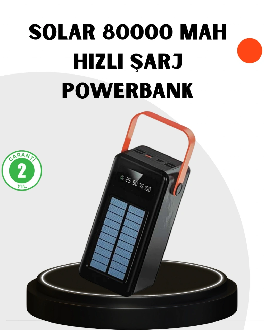 80000 mAh Solar Powerbank, hızlı şarj desteği ve yüksek kapasitesiyle günlük hayatın vazgeçilmez aksesuarlarından biridir. Güçlü bataryası sayesinde telefonunuzu defalarca şarj edebilir, uzun yolculuklarda ve doğa aktivitelerinde kesintisiz enerji elde edebilirsiniz.Üzerinde bulunan çoklu kablolar sayesinde farklı cihazlar için ekstra ekipman taşımanıza gerek kalmaz. Solar paneli, güneş enerjisinden destek alarak çevre dostu bir kullanım sunar. Dahili LED feneri, karanlık ortamlarda pratik bir aydınlatma sağlar.Akıllı akım koruma teknolojisi, cihazlarınızı güvenle şarj etmenizi sağlar. Dijital gösterge, pil durumunu net şekilde gösterir. Kompakt yapısı ve dayanıklı tasarımıyla uzun süreli kullanım için uygundur.
