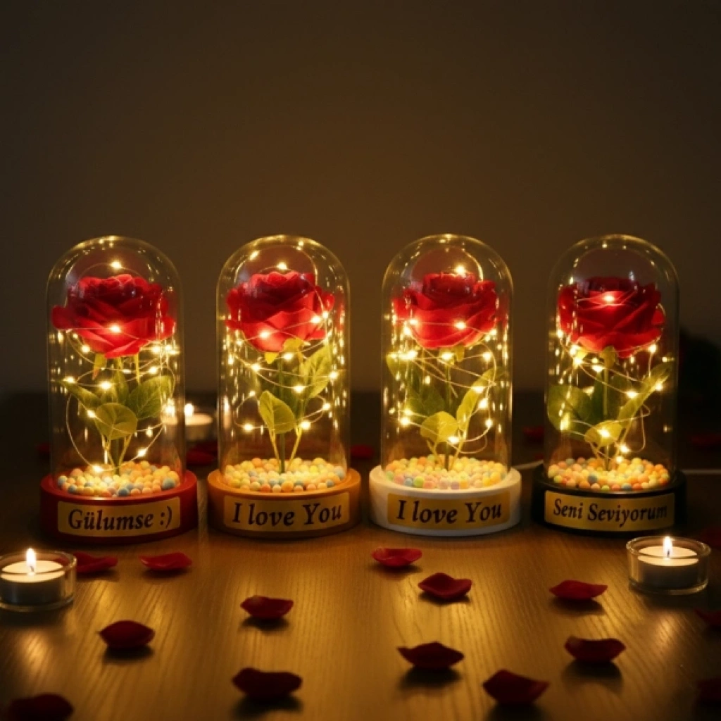 RENKLİ TOPLU LEDLİ GÜL FANUSÜrün ÖzellikleriRenkli toplu ledli gül fanus, canlı detayları ve sıcak ışık etkisiyle dekorasyona enerjik ve romantik bir hava katan şık bir üründür. Şeffaf fanus içerisinde yer alan tekli yapay gül, taban kısmındaki renkli toplar ile birlikte görsel olarak dikkat çekici bir bütünlük sunar. Sahip olduğu gün ışığı LED aydınlatma sayesinde yumuşak ve huzur verici bir ışık yayarak masa, komodin ve raf üzerinde estetik bir ambiyans oluşturur. Kompakt ölçüsüyle yer kaplamadan kullanılabilen bu model, özellikle özel günlerde dekoratif gül fanus arayanlar için ideal bir tercihtir. Model seçimi yapılamayan ürün, görsellerde yer alan tasarımlardan biri olacak şekilde karışık model gönderimi yapılmaktadır.Ürün Teknik Özellikleri Özellik Açıklama Ürün Adı Renkli Toplu Ledli Gül Fanus Boyut 10 x 18 cm Aydınlatma Gün ışığı LED Tasarım Şeffaf fanus, tekli gül Detay Taban kısmında renkli toplar Model Karışık gönderilir Kullanım Alanı Masa, komodin, raf Kullanım Amacı Dekoratif ve hediyelik Paket İçeriği1 adet renkli toplu ledli gül fanus
