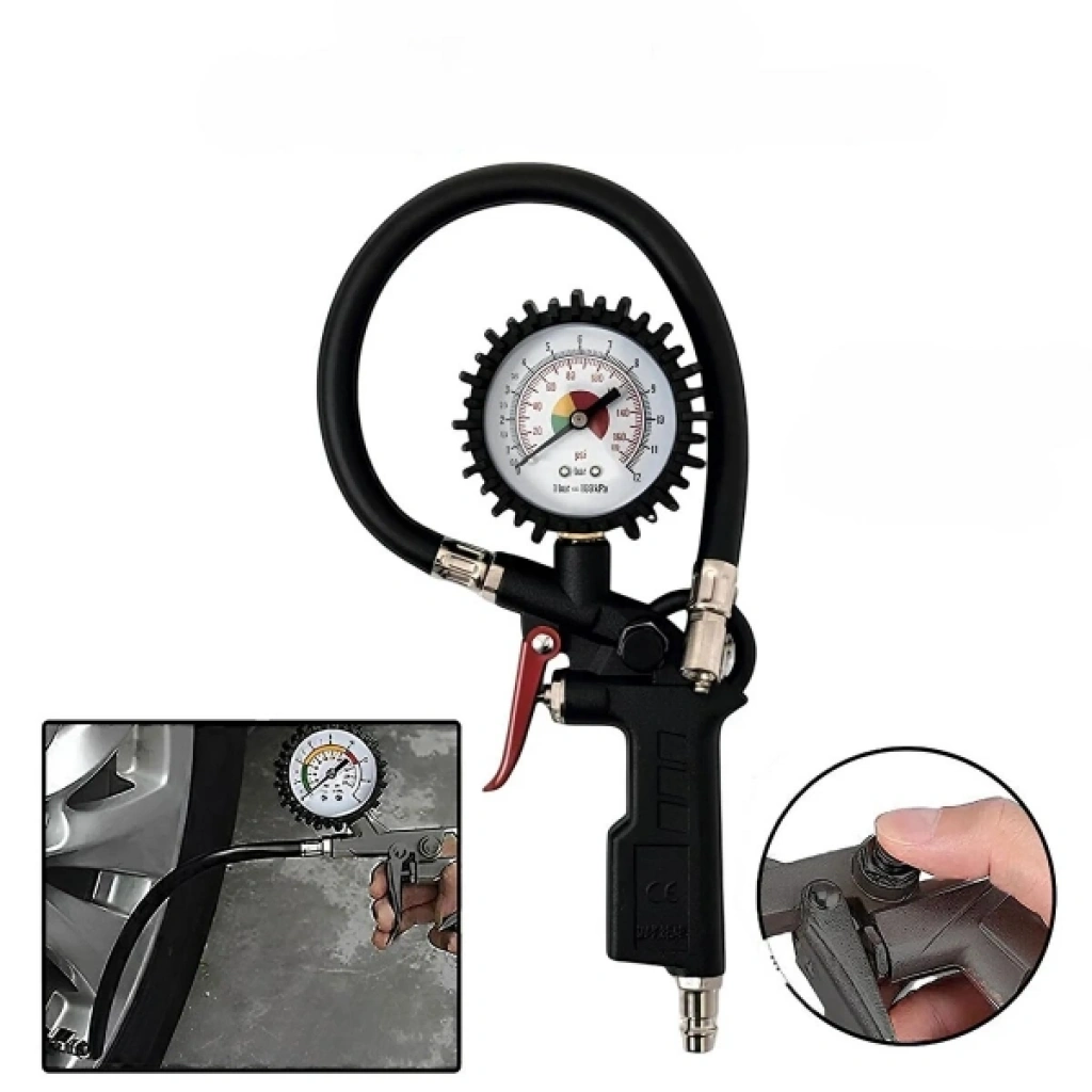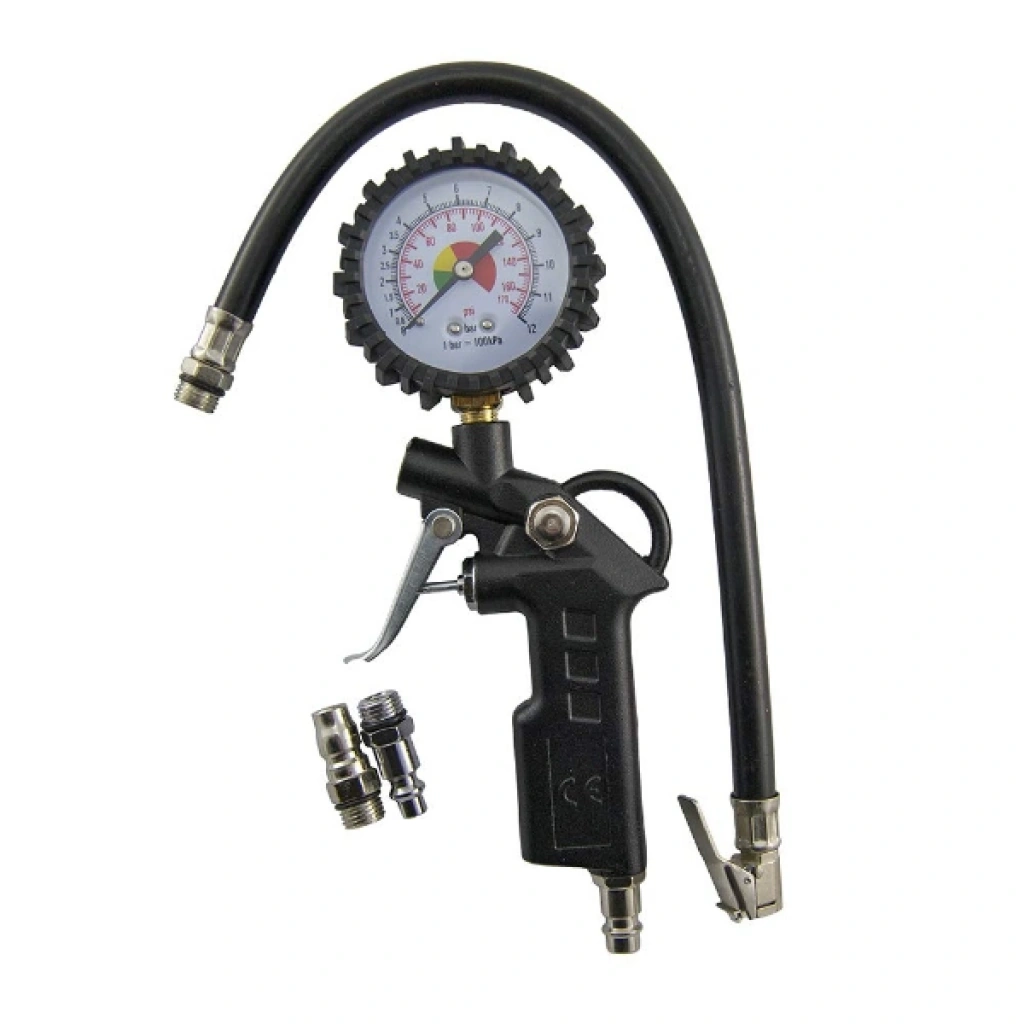 SAATLİ HAVA TABANCASIÜrün ÖzellikleriSaatli hava tabancası, araç lastiklerinin hava basıncını ölçmek ve doğru seviyeye getirmek için profesyonel bir çözümdür. Üzerinde bulunan hassas manometre sayesinde lastik basıncı bar ve psi cinsinden kolayca takip edilebilir. 0-8.5 bar / 0-120 psi ölçüm kapasitesine sahiptir.500 mm hortum uzunluğu ile kullanımda esneklik sağlar. Dayanıklı metal gövdesi ve ergonomik tetiği sayesinde uzun süreli kullanımlarda konfor sunar. Hızlı ve güvenilir hava dolumu için tasarlanmış bu ürün, hem profesyonel servislerde hem de kişisel araç bakımında ideal bir yardımcıdır.Paket İçeriği1 adet saatli hava tabancası