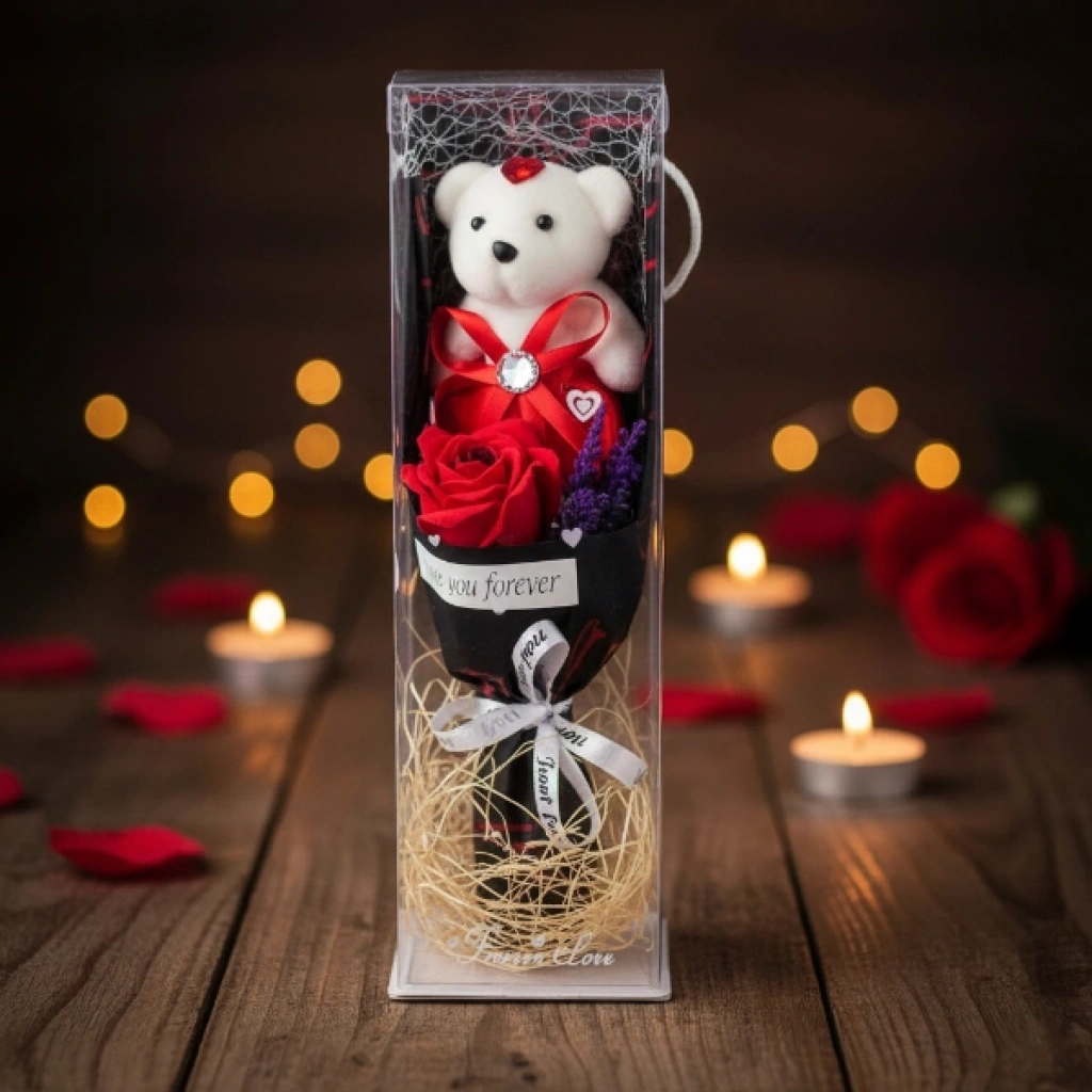 Nevamel® Şeffaf Kutulu Ayıcıklı Gül Buketi