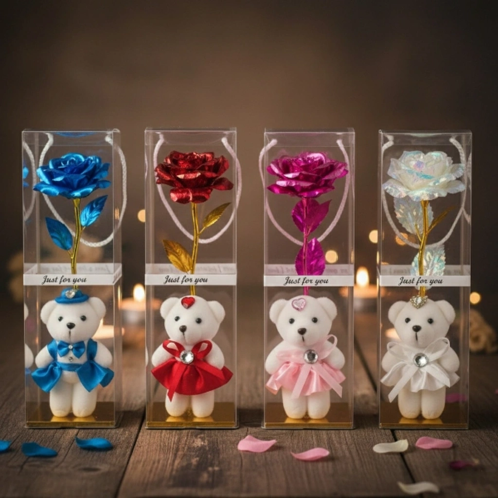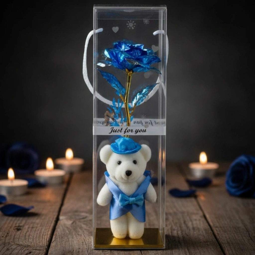 ŞEFFAF KUTULU AYICIKLI SONSUZLUK GÜLÜÜrün ÖzellikleriŞeffaf kutulu ayıcıklı sonsuzluk gülü, özel günlerde kalıcı ve anlamlı bir hediye sunmak isteyenler için tasarlanmış dekoratif bir aranjmandır. Şeffaf koruyucu kutu içerisinde yer alan metalik görünümlü gül ve sevimli ayıcık detayı, ürüne şık ve dikkat çekici bir görünüm kazandırır. Uzun saplı gül tasarımı ile klasik buket formunu modern bir sunumla birleştirir. İç kısmında bulunan ayıcık strafor malzemeden üretilmiştir ve dekoratif amaçlı kullanıma uygundur. Ayıcıklı sonsuzluk gülü tasarımı sayesinde sevgililer günü, doğum günü, yıl dönümü ve özel kutlamalarda tercih edilebilir. Masa, vitrin ve raf üzerinde sergilenebilen şeffaf kutulu dekoratif gül, uzun süre formunu koruyarak kalıcı bir hatıra niteliği taşır. Renk seçimi yapılamaz, ürün görseldeki renklerden biri karışık olarak gönderilir. Dekoratif hediye gülü hem romantik hem de estetik bir sunum arayanlar için ideal bir alternatiftir.Ürün Teknik Özellikleri Özellik Açıklama Ürün Adı Şeffaf Kutulu Ayıcıklı Sonsuzluk Gülü Malzeme Strafor ayıcık ve dekoratif gül Renk Görseldeki renklerden biri, karışık gönderim Kullanım Alanı Hediye ve dekoratif süs Paket İçeriği1 adet şeffaf kutulu ayıcıklı sonsuzluk gülü (renkler karışık gönderilir)
