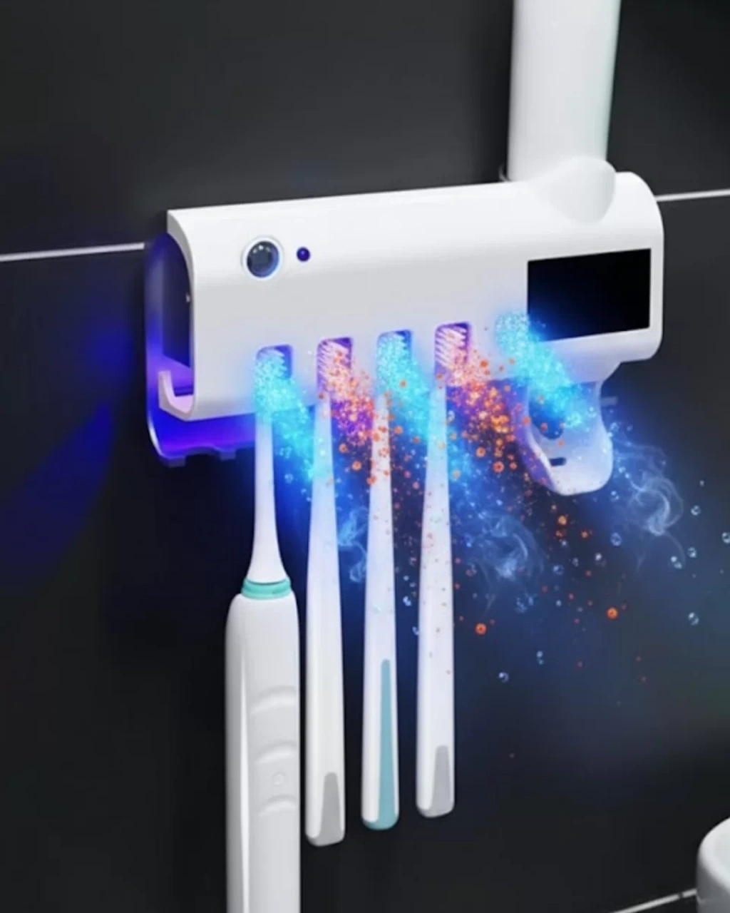 Bu çok fonksiyonlu diş fırçası tutucu, UV sterilizasyon, otomatik diş macunu sıkma ve düzenleyici tasarımı tek üründe birleştirir. Manyetik diş fırçası fincan sistemi sayesinde fırçalar ters şekilde asılarak hızlı kuruma sağlar. Su geçirmez plastik malzemeden üretilmiş gövdesi, banyo ortamına uzun süre dayanıklıdır. Otomatik diş macunu dağıtıcısı, her kullanımda ideal miktarda macun almanızı sağlar ve israfı önler. Alan tasarrufu sağlayan yapısıyla küçük banyolar için mükemmel bir çözümdür.