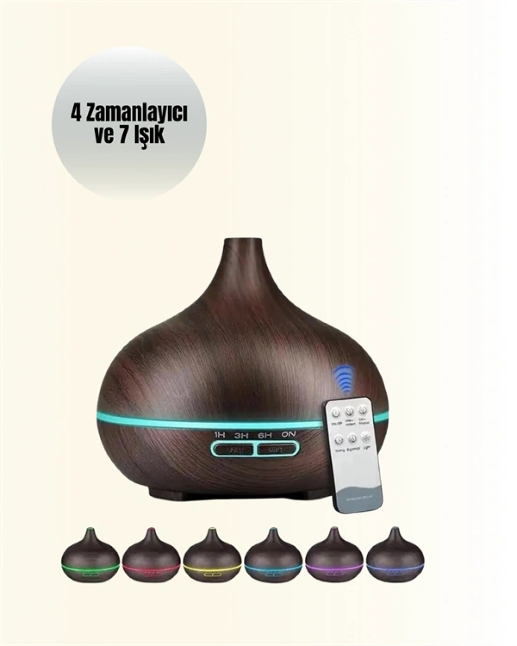 Ultrasonik soğuk buhar teknolojisiyle çalışan bu difüzör, 550 ml su kapasitesi ile uzun süreli kullanım sunar. Su haznesine eklenen uçucu yağlar ile ortamda doğal koku yayılımı sağlanır. Cihaz, zamanlayıcı ayarı ile 1 saat, 3 saat, 6 saat ya da sürekli çalışacak şekilde programlanabilir. Su bittiğinde ya da zaman dolduğunda otomatik olarak kapanır. Difüzör 7 farklı ortam ışığı ile donatılmış olup her ışık için loş ve parlak mod seçenekleri mevcuttur. Su ısıtılmadan buhar oluşturduğu için enerji tasarrufludur ve sessiz çalışması sayesinde gece kullanımı için uygundur.