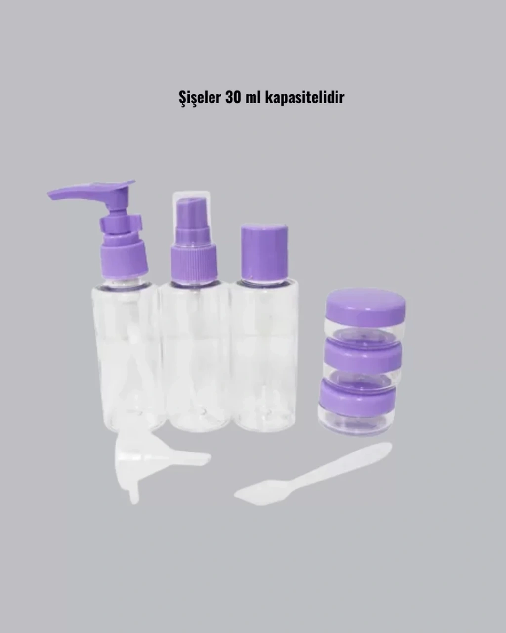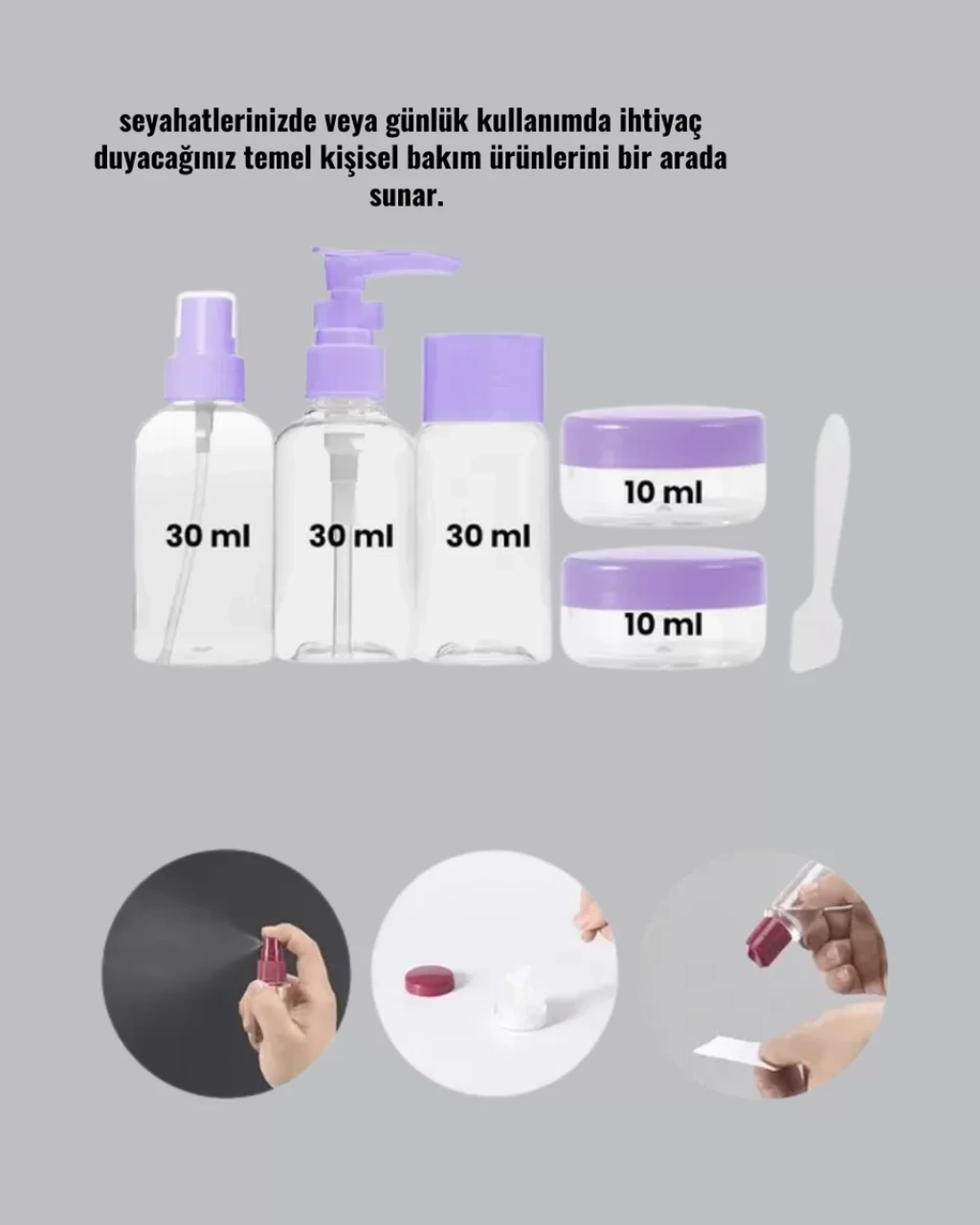 Seyahat Banyo Seti 5 Parça, hem kısa seyahatlerde hem de uzun tatillerde kişisel bakım ihtiyaçlarını pratik şekilde karşılamak için tasarlanmış kompakt ve kullanışlı bir settir. Setin içinde 1 adet şampuanlık, 1 adet sprey şişe, 1 adet nemlendirici veya sabunluk olarak kullanılabilen şişe ve 2 adet krem kutusu bulunur. Ayrıca tüm ürünleri düzenli şekilde taşıyabilmeniz için pratik bir şeffaf taşıma çantası da setin içerisindedir. Şişelerin her biri 30 ml kapasiteye sahiptir, bu sayede uçak kabin bagajı kurallarına uygundur ve güvenlik kontrollerinden sorunsuzca geçebilir. Şeffaf malzemeden üretilen şişeler, içerisindeki ürünün kolayca görünmesini sağlar. Sızdırmaz kapak yapısı sayesinde çanta içinde akma veya dökülme riski olmadan rahatça taşınabilir. Günlük kullanım, spor salonu, iş yeri veya okul çantasında da taşımaya uygundur. Minimal tasarımıyla hem estetik hem fonksiyonel bir çözüm sunan bu seyahat seti, kişisel bakım ürünlerini düzenli, temiz ve güvenli bir şekilde muhafaza etmek isteyen herkes için ideal bir seçenektir.