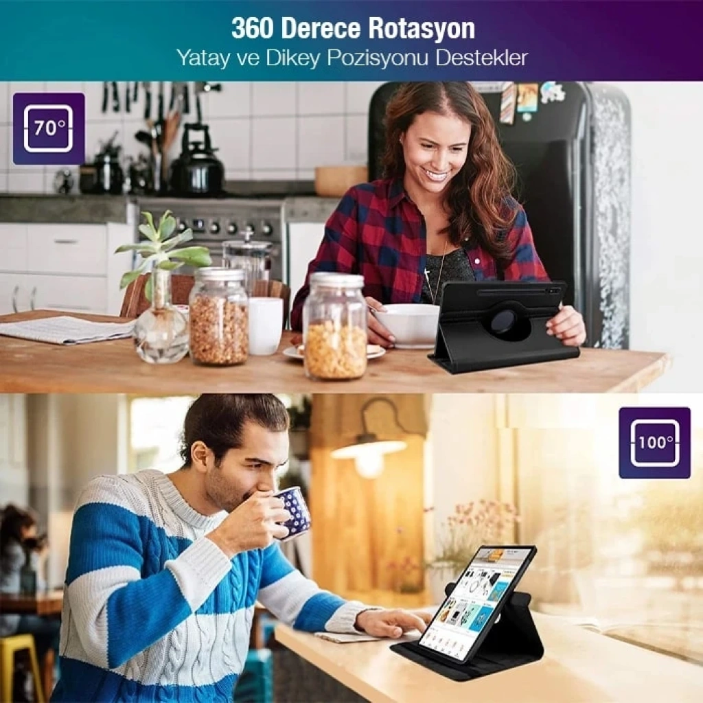 Döner tabanı sayesinde tabletinizin istediğiniz şekilde ve yönde durmasını sağlar.