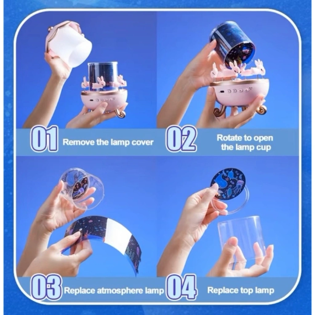 TAVŞAN ATLIKARINCA MULTİFONKSİYON PROJEKTÖRÜrün ÖzellikleriTavşan Atlıkarınca Multifonksiyon Projektör, müzik kutusu olarak da çalışabilen ve mobil cihazlar ile Bluetooth üzerinden müzik çalabilen bir üründür. Üst kısmındaki ve içteki tavşan figürleri döner, geceyi daha eğlenceli hale getirir. Cihaz, farklı ışık seviyeleri sunarak loş, orta ve güçlü aydınlatma seçenekleriyle ortamın aydınlatmasını değiştirir. Sıcak ışık, nötr ışık ve renkli ışık seçenekleriyle atmosferin tarzını değiştirebilirsiniz. Gökyüzü desenleri ve sevimli desenler içeren 12 farklı projeksiyon film diski sayesinde duvar ve tavana yıldızlar veya çeşitli desenler yansıtılabilir. USB ile şarj edilebilen bu projektör, bebek/çocuk odalarında kullanılabileceği gibi, gece lambası, uyku yardımcısı ya da hediye olarak da tercih edilebilir.Paket İçeriği1 Adet Tavşan Atlıkarınca Multifonksiyon Projektör