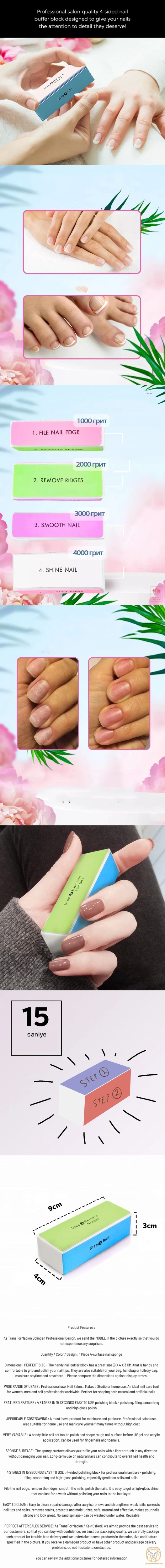 15 SN’DE 4 AŞAMALI KOLAY KULLANIM : Profesyonel manikür için 4 taraflı parlatma bloğu - cilalama, törpüleme, düzleştirme ve çok parlak cilalama, özellikle tırnaklara ve tırnaklara karşı hassastır.