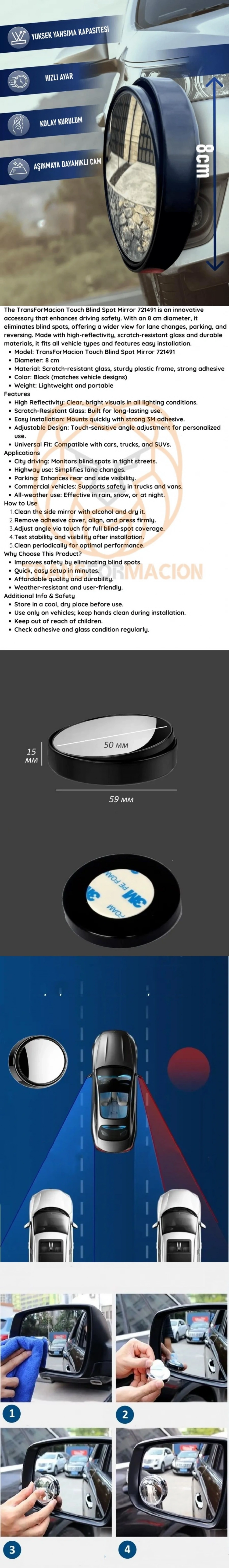 Ürün Özellikleri Bu kör nokta aynası, sürücülerin güvenliğini ön planda tutarak tasarlanmıştır. Geniş görüş açısı ve dokunmatik ayar özelliği ile kullanım kolaylığı sağlar.