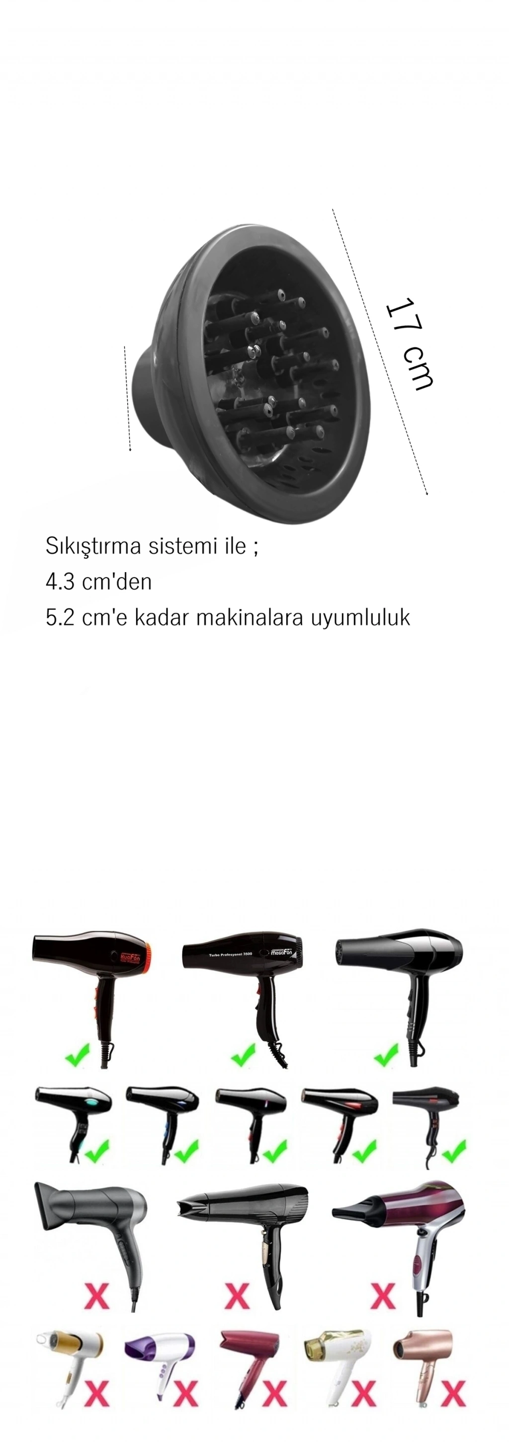 Ölçüler : 17 cm üfleme çapı - 15 ana nokta çıkışı - Sıkıştırma sistemi ile ; 4.3'den 5.2 cm çapa kadar çıkışı olan kurutma makinelerine uyumludur