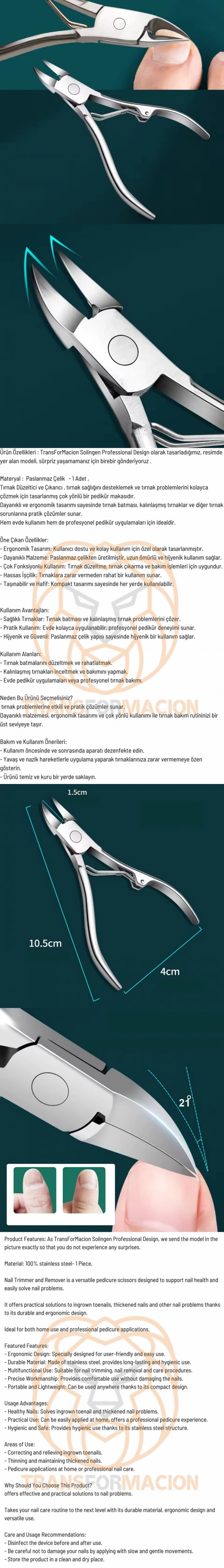 Dayanıklı ve ergonomik tasarımı sayesinde tırnak batması, kalınlaşmış tırnaklar ve diğer tırnak sorunlarına pratik çözümler sunar.