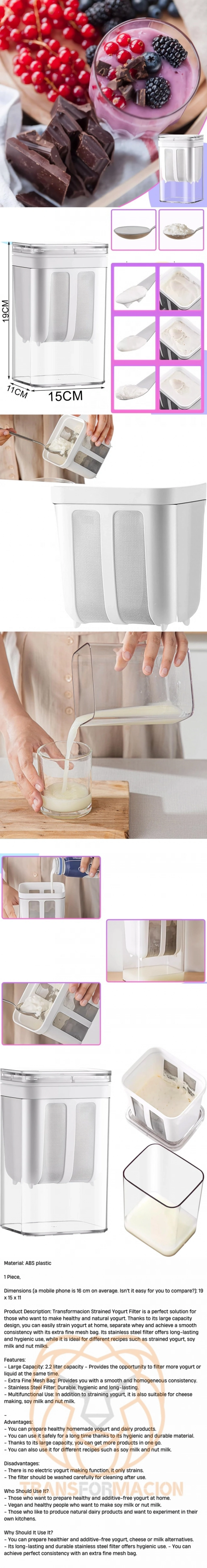 - Çok Fonksiyonlu Kullanım: Yoğurt süzmenin yanı sıra, peynir yapımı, soya sütü ve kuruyemiş sütleri için de uygundur.