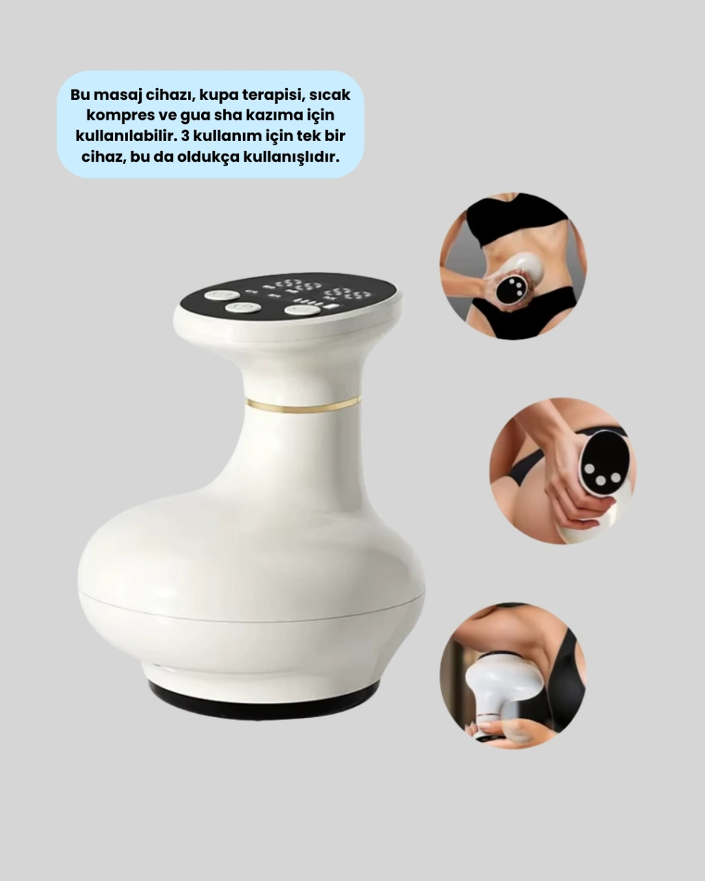 USB Şarjlı 3’ü 1 Arada Masaj Cihazı, evde profesyonel masaj deneyimi yaşamak isteyenler için pratik ve etkili bir çözümdür. Tek bir cihazda kupa terapisi, sıcak kompres ve gua sha masajını birleştirerek çok yönlü kullanım sunar. Bu sayede farklı masaj ihtiyaçları için ayrı ayrı ürünler kullanma zorunluluğunu ortadan kaldırır.Taşınabilir ve hafif yapısı sayesinde evde, ofiste veya seyahat sırasında kolayca kullanılabilir. USB şarj özelliği, ürünü her ortamda rahatça şarj etmenizi sağlar. Masaj salonlarına gitmeye gerek kalmadan, istediğiniz an masaj yaparak hem zaman hem de enerji tasarrufu elde edebilirsiniz.Kupa terapisi özelliği, cilt yüzeyinde vakum etkisi oluşturarak kan dolaşımını artırır ve kasların gevşemesine yardımcı olur. Sıcak kompres fonksiyonu, masajın etkisini güçlendirerek kas sertliğini azaltır. Gua sha kazıma modu ise cilt yüzeyini uyararak daha canlı ve pürüzsüz bir görünüm elde edilmesini destekler.Düzenli kullanımda cilt elastikiyetini artırmaya yardımcı olur ve daha sıkı bir cilt görünümü sağlar. Vücudun farklı bölgelerinde kullanıma uygun olması sayesinde baldır, uyluk, kalça, karın, kol ve sırt gibi alanlarda etkili sonuçlar sunar.Fonksiyonel yapısı, kullanım kolaylığı ve çok yönlü özellikleriyle günlük bakım rutininizin vazgeçilmez bir parçası haline gelir. Hem kendiniz hem de sevdikleriniz için ideal bir hediye alternatifidir.