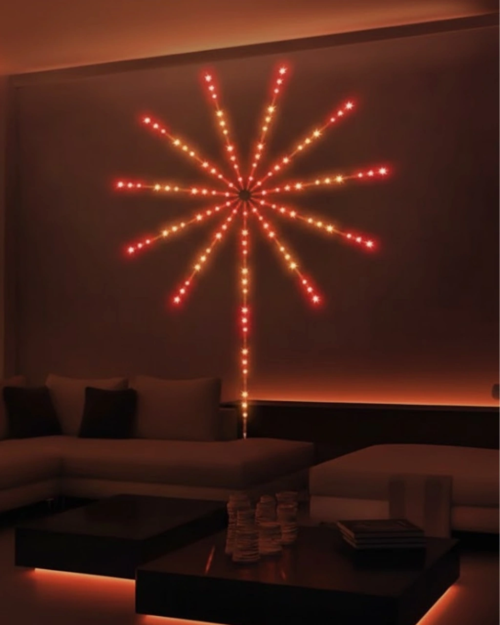 Akıllı RGB LED Havai Fişek Duvar Lambası, yaşam alanlarını sıradan aydınlatmanın ötesine taşıyan modern ve dekoratif bir aydınlatma çözümüdür. Duvara monte edilebilen starburst (havai fişek) tasarımı sayesinde bulunduğu ortama dinamik, eğlenceli ve dikkat çekici bir atmosfer kazandırır. Özellikle salon, genç odası, oyun odası, yatak odası veya parti alanları için ideal bir dekoratif üründür.Kumandalı RGB LED Starburst Duvar Lambası, iç mekânlarda dikkat çekici bir atmosfer oluşturmak için tasarlanmış dekoratif bir aydınlatma ürünüdür. Duvara monte edilen yıldız patlaması formu, klasik aydınlatma ürünlerinden farklı olarak sanatsal bir görünüm sunar. Salon, genç odası, oyun odası veya özel etkinlik alanları için ideal bir dekoratif çözümdür.Ürün, sökülebilir LED kollardan oluşan modüler bir yapıya sahiptir. Bu sayede kullanıcı, ışık kollarını kendi zevkine göre düzenleyebilir. Simetrik bir yıldız görünümü ya da daha özgür bir tasarım oluşturmak mümkündür. Kurulumu pratik olup, duvar yüzeyine zarar vermeden sabitlenebilir.RGB LED teknolojisi sayesinde çok sayıda renk ve efekt seçeneği sunar. Tek renkli aydınlatmalar, geçişli renk modları ve hareketli efektler ile farklı ambiyanslar yaratılabilir. Uzaktan kumanda ile açma-kapama, renk değiştirme, parlaklık ayarı ve mod seçimi kolayca yapılabilir.Bazı modlarda müzikle senkronize çalışabilme özelliği sayesinde ışıklar ses ritmine göre hareket eder. Bu özellik, özellikle eğlence ve parti ortamlarında ürünü daha da cazip hale getirir. Ortamın enerjisine göre dinamik ya da sakin bir ışık atmosferi oluşturmak mümkündür.USB güç girişi ile çalışan ürün, düşük enerji tüketimi sayesinde uzun süreli kullanımlarda avantaj sağlar. Bilgisayar, adaptör veya taşınabilir güç kaynaklarıyla rahatlıkla kullanılabilir. Düşük ısı üretimi sayesinde güvenli bir kullanım sunar.Kumandalı RGB LED Starburst Duvar Lambası, dekorasyonuna modern, eğlenceli ve teknolojik bir dokunuş katmak isteyen kullanıcılar için estetik ve işlevsel bir aydınlatma çözümüdür.