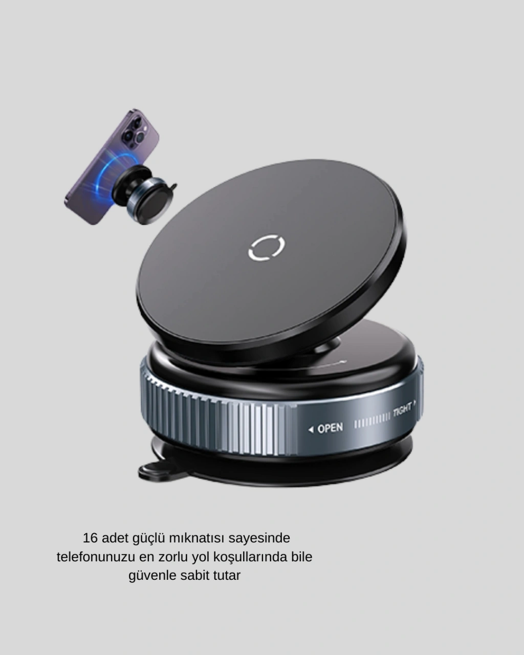 Bu gelişmiş manyetik telefon tutucu, günlük kullanımda maksimum stabilite ve esneklik sunmak için tasarlanmış yüksek teknoloji bir üründür. Özellikle araç içi kullanımda güvenli sürüş deneyimi sunarken, aynı zamanda ev içi ve spor alanlarında da çok yönlü bir yardımcı görevi görür. Yenilikçi vakum adsorpsiyon sistemi, yalnızca bir çevirme hareketiyle yüzeye güçlü şekilde sabitlenir. Cam yüzeyler, düz konsollar, pencereler, banyodaki aynalar veya masa üstleri gibi pürüzsüz alanlarda üstün tutuş sağlar.N52 sınıfı halkasal mıknatıs, piyasadaki en güçlü manyetik yapı taşlarından biridir ve 35.27 oz seviyesinde çekim gücü sunar. Bu güçlü manyetik halka, telefonu anında kavrar ve araç ani fren yapsa bile düşmesine izin vermez. 8000’den fazla dayanıklılık testinden başarıyla geçmiş olması, ürünü uzun ömürlü ve güvenilir kılar.Tutucunun 360° dönebilen tasarımı, her kullanım senaryosunda optimum açı sunar. Araç kullanırken navigasyonu rahatça görebilir, spor yaparken telefonu dik konumda sabitleyebilir veya mutfakta tarif izlerken yatay moda geçebilirsiniz. İçerik üreticileri için hem dikey hem yatay çekimlerde stabil bir platform oluşturur.Tüm iPhone 12-13-14-15-16 serileri ile birebir uyumlu çalışır. Eğer telefonunuz veya kılıfınız manyetik değilse, kutuda gönderilen metal halkayı cihazınıza yapıştırarak uyumlu hale getirebilirsiniz. Halkayı yapıştırdıktan sonra 24 saat bekletmek, maksimum manyetik performans sağlar.Şık, kompakt ve sağlam yapısıyla hem günlük kullanım hem de yolculuklar için ideal bir çözümdür. Evde, ofiste, banyoda, mutfakta veya arabada telefon kullanımını daha güvenli, pratik ve modern hale getirir.
