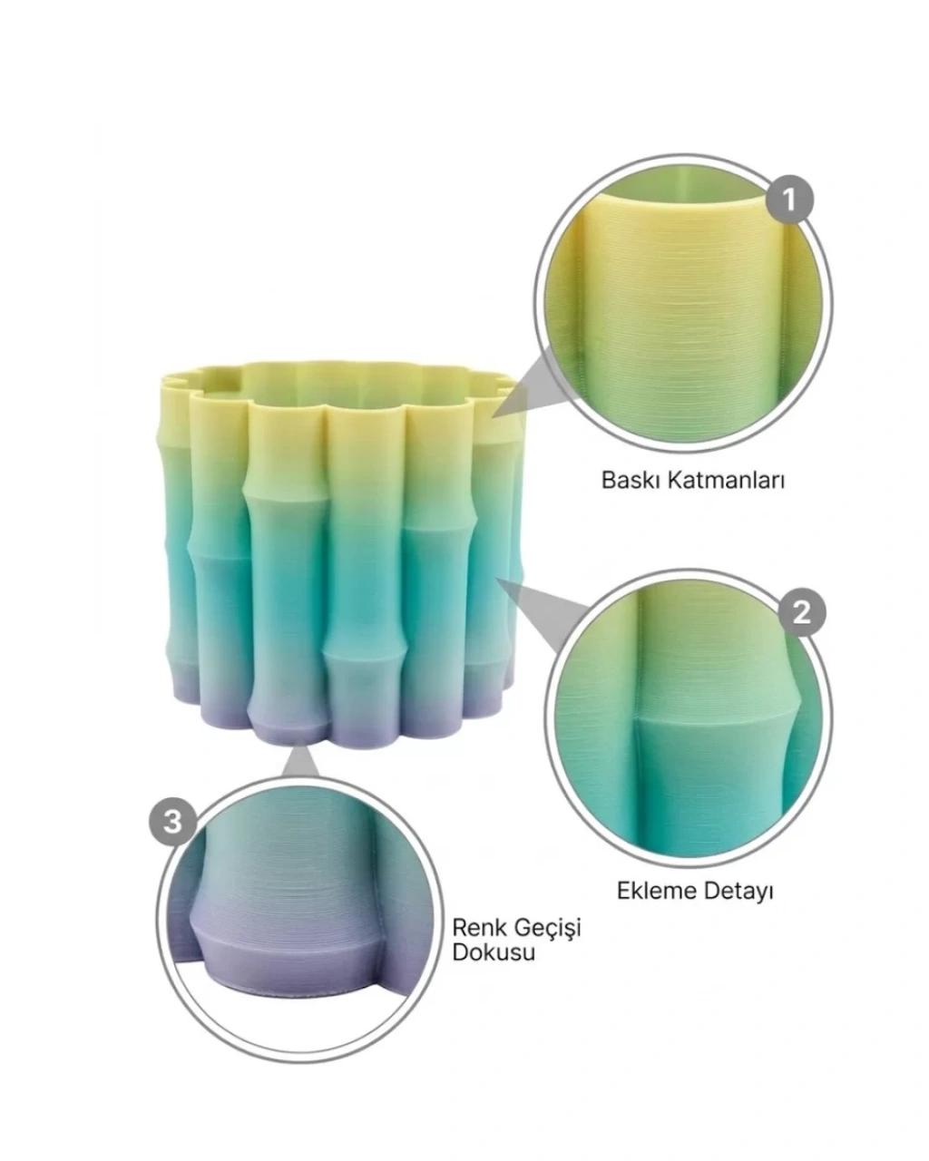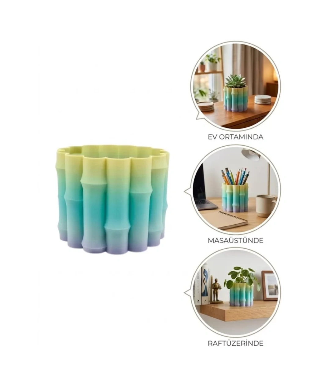 Doğadan ilham alan yeşil tonları ve modern tasarım çizgileri ile öne çıkan bu dekoratif vazo, yaşam alanlarına ferahlık ve zarafet katmak isteyenler için ideal bir seçenektir. Renk geçişlerindeki uyum ve yüzey tasarımındaki detaylar, ürünü sade ama etkileyici bir dekoratif obje haline getirir.Ürünün silindirik formu ve yüzeyindeki özel dalgalı yapı, klasik tasarımlardan farklı bir görünüm sunar. Işığa göre değişen yeşil tonları, bulunduğu ortama derinlik kazandırır ve estetik bir bütünlük sağlar. Bu sayede hem modern hem de minimalist dekorasyon stillerine kolayca uyum sağlar.Kullanım alanı oldukça geniştir. Salon, yatak odası, ofis, çalışma masası, kitaplık veya giriş alanlarında rahatlıkla kullanılabilir. Tek başına dekoratif bir obje olarak tercih edilebileceği gibi, içerisine yerleştirilecek çiçeklerle daha canlı ve doğal bir görünüm elde edilebilir.Dayanıklı malzemesi sayesinde uzun ömürlü kullanım sunar. Hafif yapısı ile kolay taşınabilir ve farklı alanlarda pratik şekilde konumlandırılabilir. Kolay temizlenebilir yüzeyi sayesinde bakım gerektirmez.Modern ve şık tasarımı ile dikkat çeken bu vazo, hem kendi yaşam alanlarınız için hem de sevdiklerinize hediye etmek için ideal bir dekorasyon ürünüdür.
